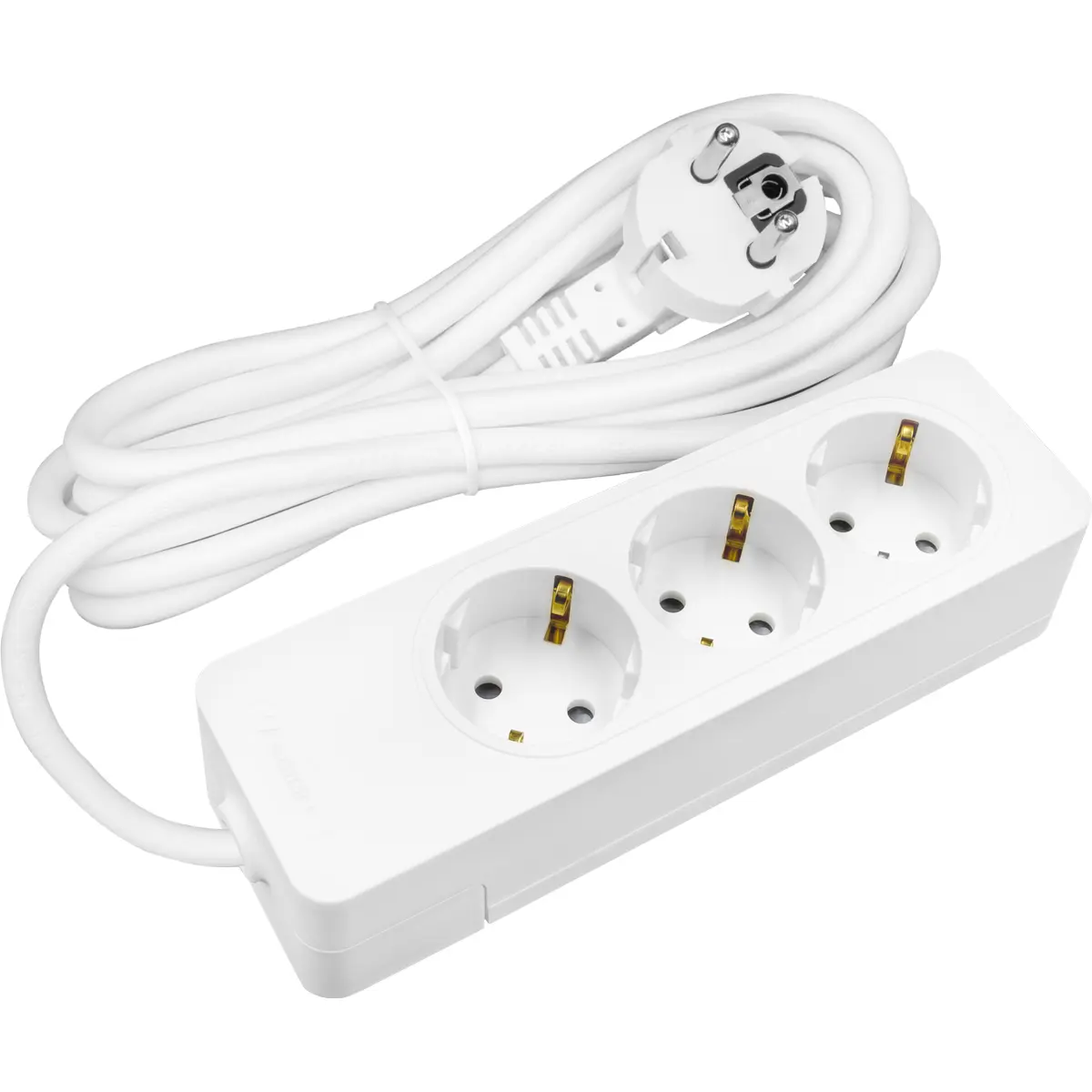 Bloco de tomadas com cabo de 3,0 m, equipado com três tomadas Schuko fêmeas compatíveis com o padrão Schuko/Tipo F (CEE 7/7). O cabo é do tipo H05VV-F, 3G1.5mm², na cor branca, sem fusível, adequado para ligar vários dispositivos europeus com ligações estáveis. Ideal para organização de cabos em casa ou no escritório, mantendo a compatibilidade elétrica e a simplicidade de uso com conectores Schuko.