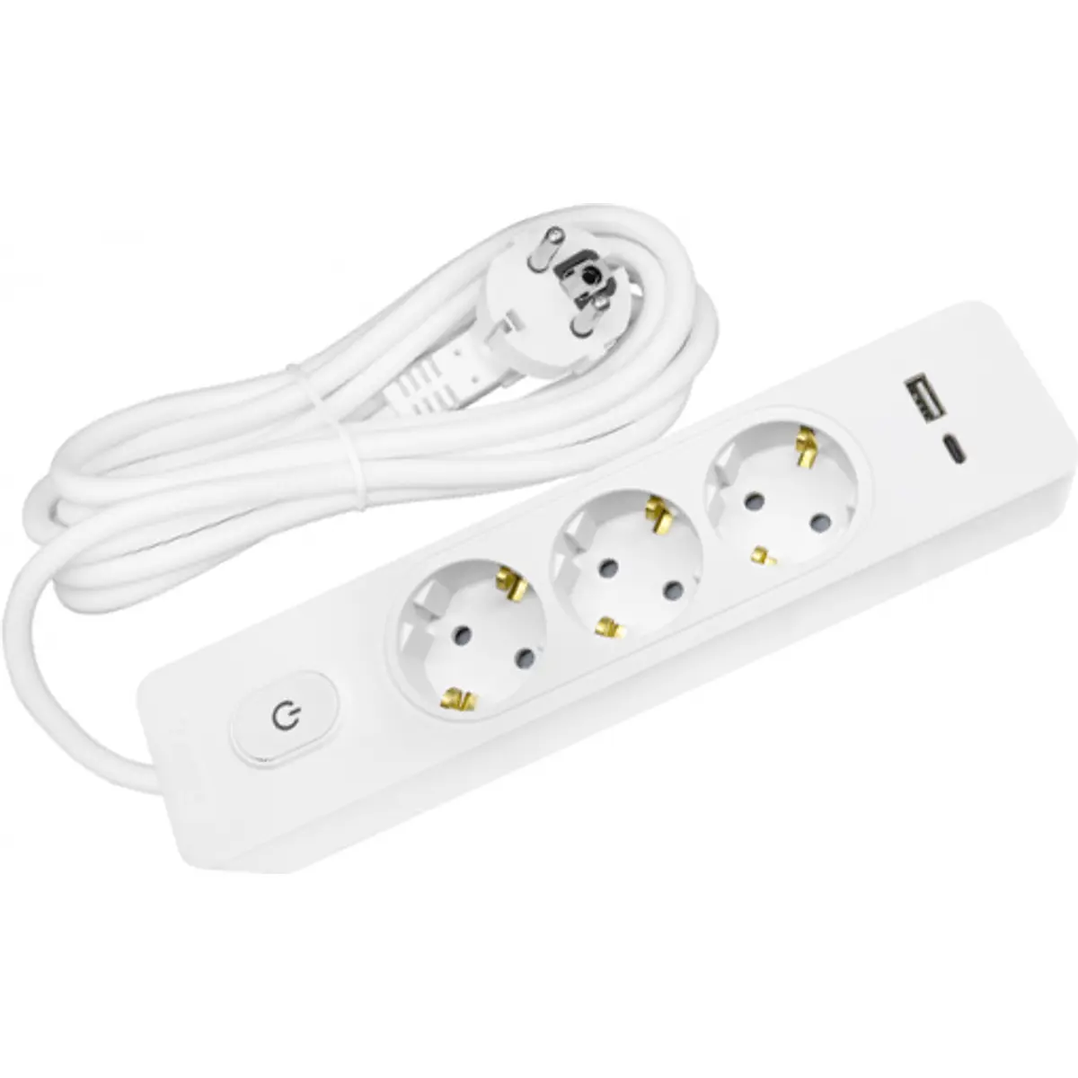 Bloco de tomadas com três tomadas fêmeas, interruptor ON/OFF e carregador USB A+C PD 20W integrado para uso interior. Liga a rede 220-240 V, 50 Hz, suportando até 3680 W e 16 A. O cabo de alimentação H05VV-F 3G1.5mm² tem 3 m de comprimento, facilitando a posição junto de mesas. Fabricado em PVC com IP20 para uso interno, oferece fiabilidade, segurança e conveniência para escritórios, salas e áreas de trabalho.