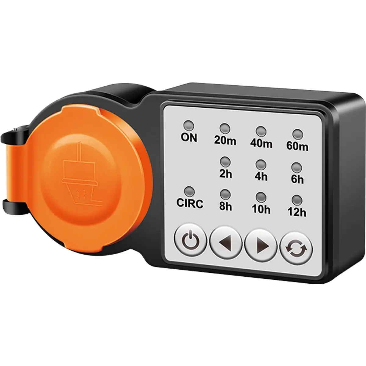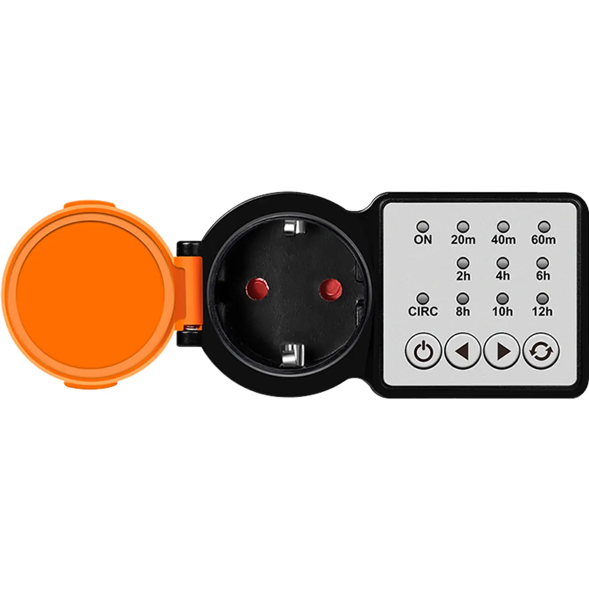 Temporizador versátil ideal para uso interior e exterior, com proteção IP44 contra salpicos. Permite configurar temporizações de 20 minutos até 12 horas ou activar a função de ciclo repetitivo a cada 24 horas. Operação simples por quatro botões e indicação por LEDs coloridos. Robusto e resistente, suporta até 3600 W.