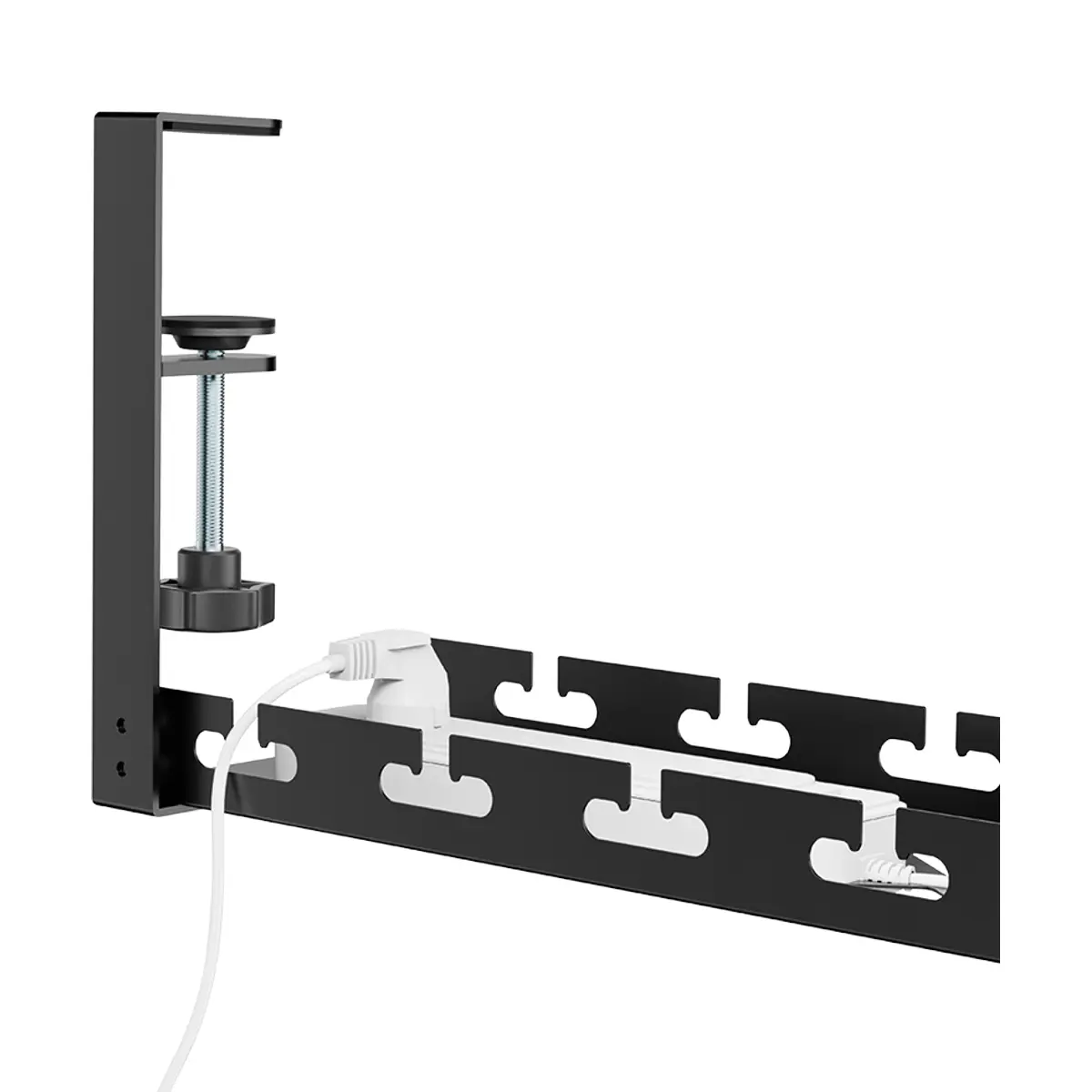 Organizador de cabos extensível em aço preto, ideal para mesas de secretária, incluindo mesas elevatórias. A bandeja de gestão é ajustável de 43,3 a 72,8 cm e montada por braçadeira clamp-on, oferecendo instalação simples sem perfurações. A estrutura aberta facilita a ventilação e o acesso aos cabos, permitindo reorganizar vários cabos nas ranhuras dedicadas. Inclui fitas de gestão para prender cabos; compatível com diferentes larguras de secretária e suporta até 5 kg.