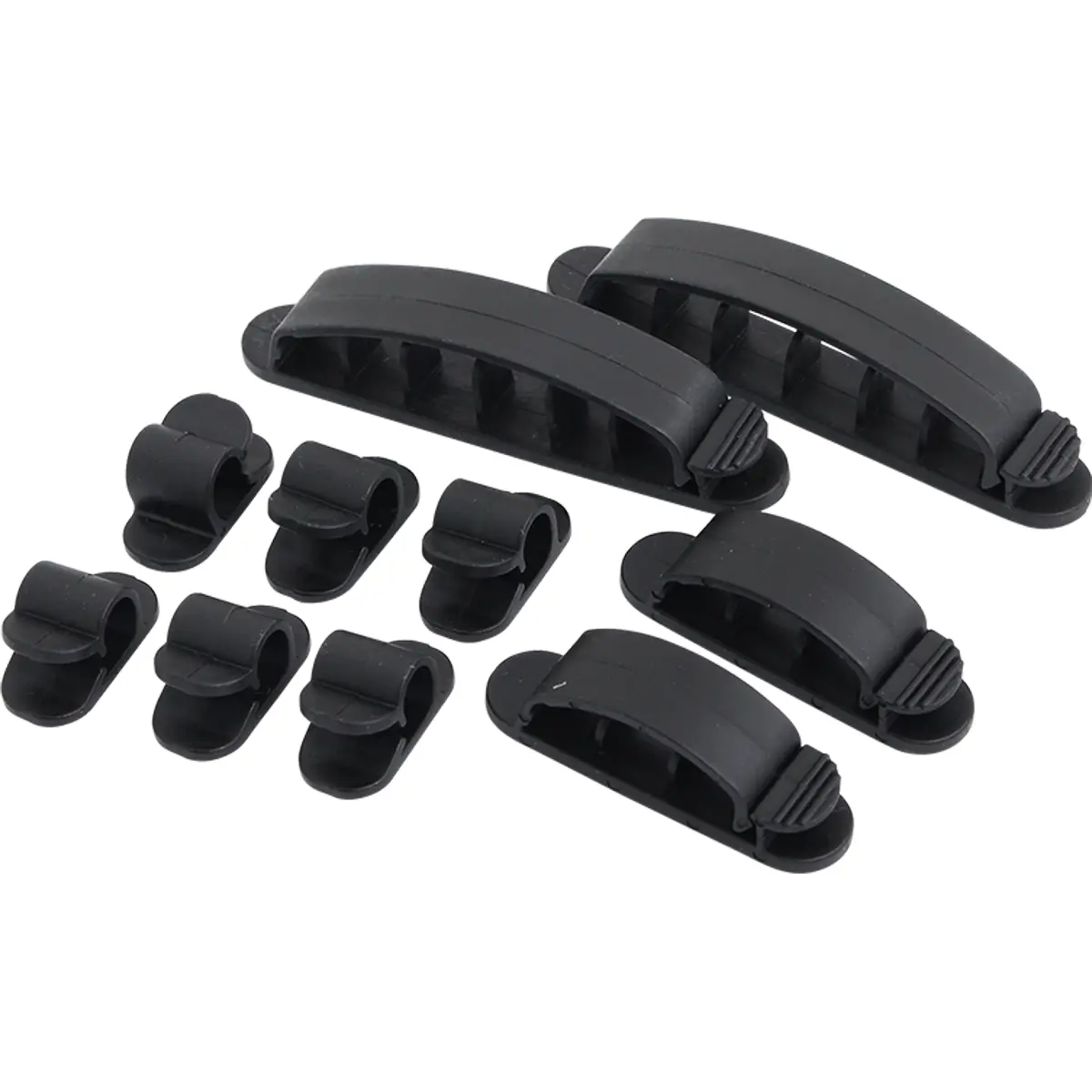 Conjunto de 10 organizadores de cabos com fixação adesiva para superfícies lisas, como mesas, cantos e prateleiras. Disponível em três tamanhos, permite fixar entre 1 e 6 cabos, com tampa que facilita abrir e fechar para adicionar ou remover cabos. Cor preta. Conteúdo inclui 6 fixadores pequenos, 2 médios e 2 grandes, ideal para manter a ordem dos cabos de forma discreta e prática.