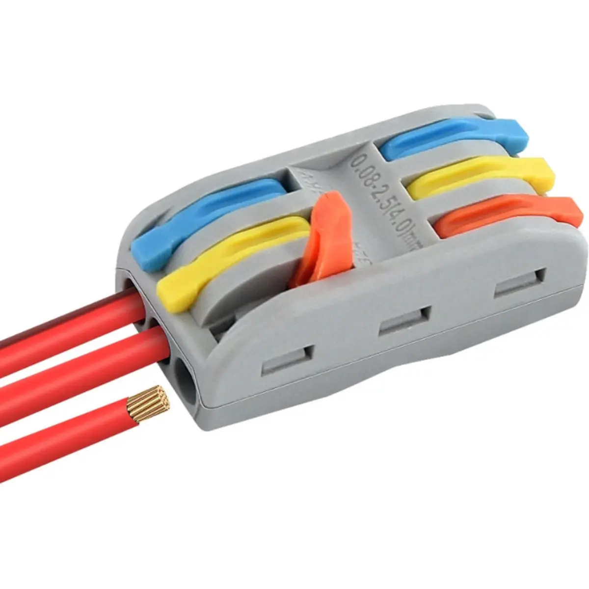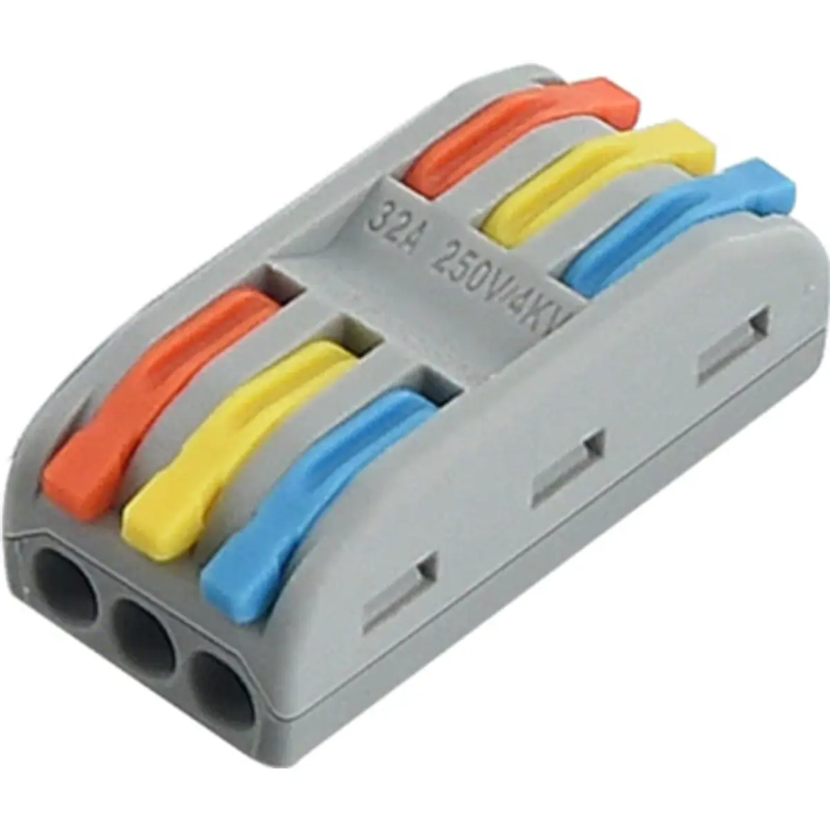 Ligador rápido sem parafusos concebido para unir condutores em instalações elétricas, compatível com cabos unifilares ou multifilares. As alavancas de libertação permitem uma ligação rápida, segura e sem ferramentas, poupando tempo e espaço. Suporta bitolas entre 0,08 e 4 mm², corrente máxima de 32 A e tensão máxima de 250 V AC, com grau de proteção IP20 e certificações CE e RoHS. Pode combinar cabos entrançados e sólidos na mesma ligação, oferecendo montagem compacta para espaços reduzidos em instalações elétricas.