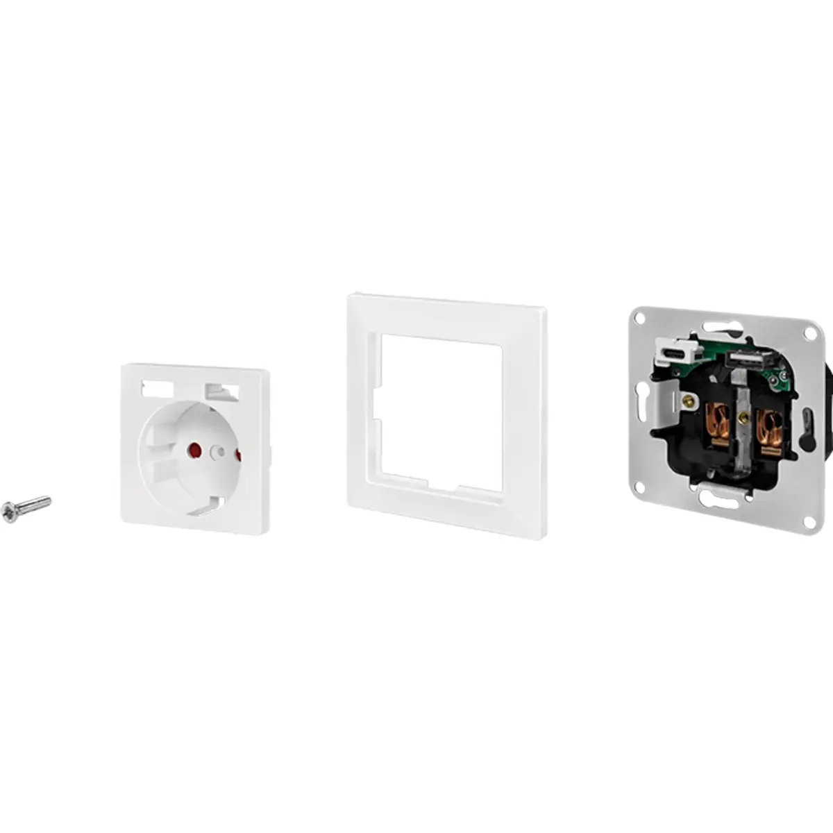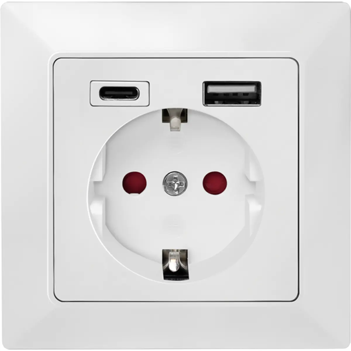 Tomada de parede Schuko com duas portas USB (USB-C e USB-A) que permite carregar dois dispositivos em simultâneo sem bloquear a tomada. Fornece 5 V a 2,8 A (máx. 14 W) nas portas USB e 230 V AC até 16 A (3600 W) para a tomada. Com profundidade de 30 mm, montagem embutida em caixa padrão 55 x 55 mm, e obturador de proteção. Possui proteção contra curto-circuito e sobrecarga nas portas USB. Ideal para interiores em casas, escritórios e hotéis; fabricada segundo CE e RoHS; instalação por eletricista qualificado.