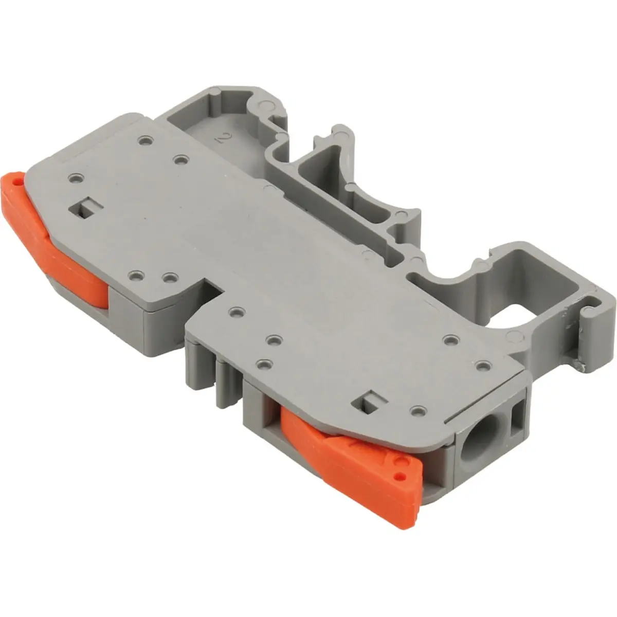 Ligador rápido compacto de uma via para montagem em calha DIN, com bloqueio por alavanca, empilhável e com ligação equipotencial. Indicado para emendas de cabos, com orifício central para ligação de pontes entre várias ligações ou para teste de alimentação. Compatível com fios até 6 mm².