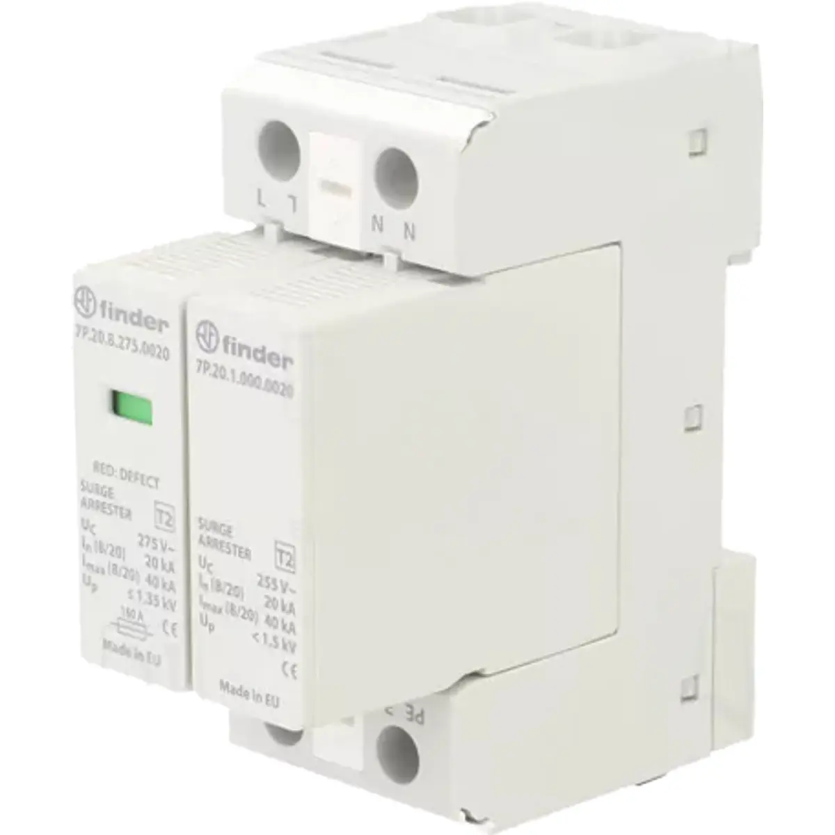 Dispositivo de proteção contra sobretensões para sistemas monofásicos TT e TN-S com neutro. Combina varistor e centelhador a gás para proteção L-N e N-PE, com módulos substituíveis. Possui indicador visual do estado do varistor e contacto remoto opcional para sinalização.
