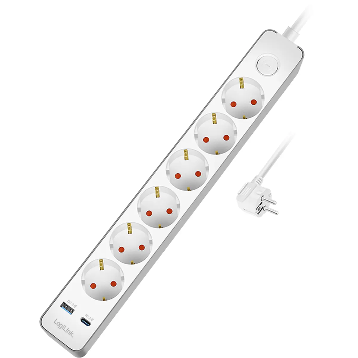 Logilink LPS288U - Bloco 6 tomadas c/interruptor + USB-A/C 3A PD 20W - cabo (3x1.5mm²) 1.4m - branco