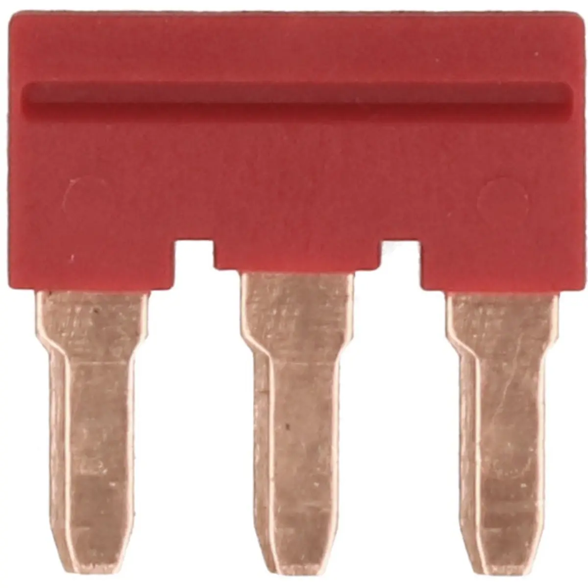 Jumper para bornes de ligação rápida DIN, de 3 vias e cor vermelha, compatível com conectores CON5221, CON5226 e CON5231. Conta com contatos de cobre, suporta até 32 A e 450 Vca, e funciona em faixas de temperatura de -20 °C a 85 °C. Ideal para ligações simultâneas de vários bornes em painéis elétricos, assegurando ligações seguras e estáveis.