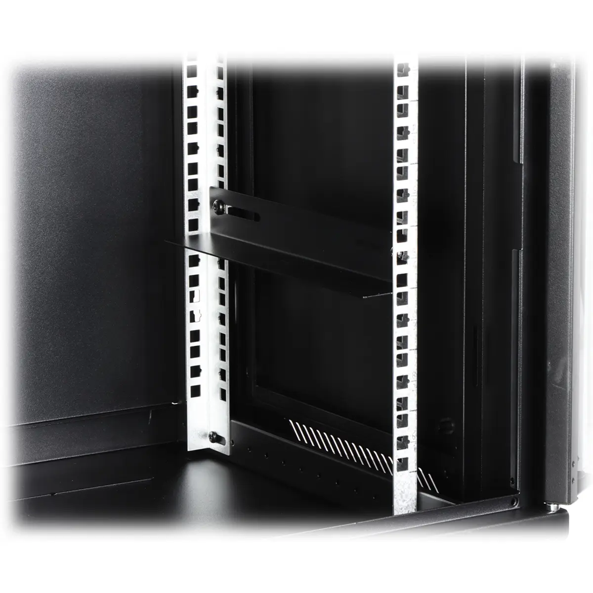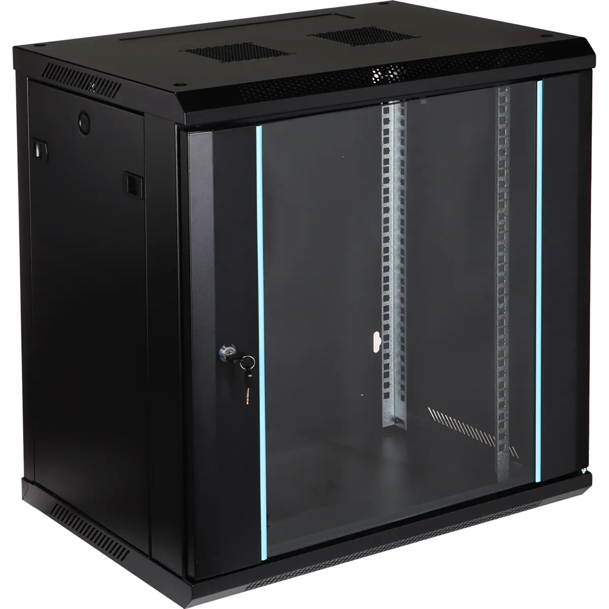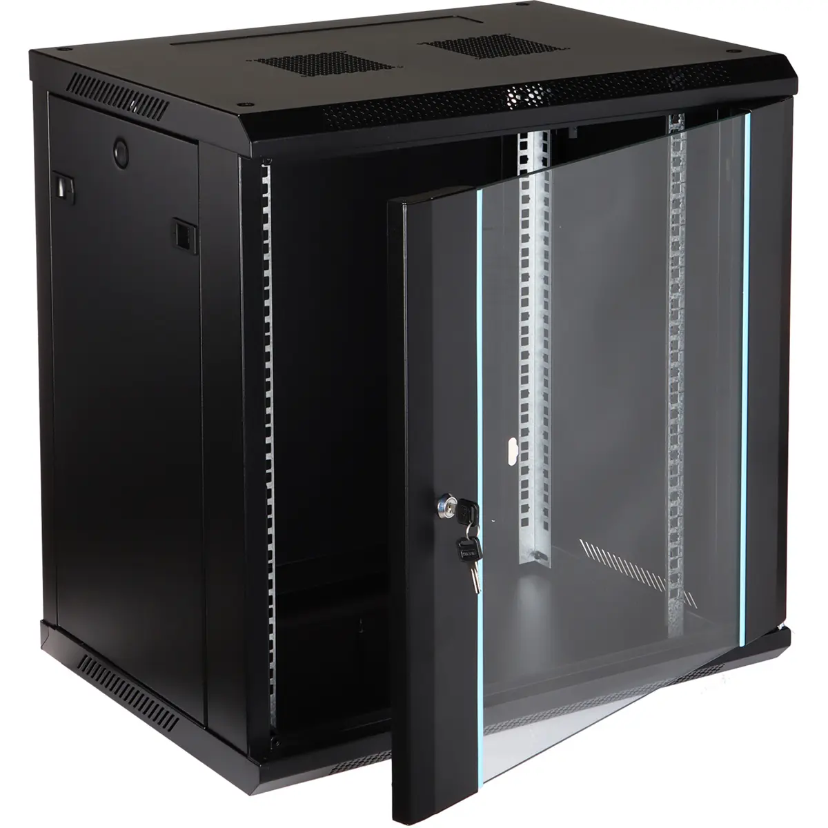 A porta frontal em vidro temperado permite visualização do interior, mantendo segurança e controlo de acessos. Os painéis laterais removíveis facilitam a instalação e manutenção, para acesso rápido aos equipamentos e cablagem. O armário inclui ventilação passiva, com aberturas que ajudam a dissipar o calor, o que contribui para o funcionamento estável dos equipamentos. Fornecido em formato desmontado, permite transporte facilitado e montagem simples no local.