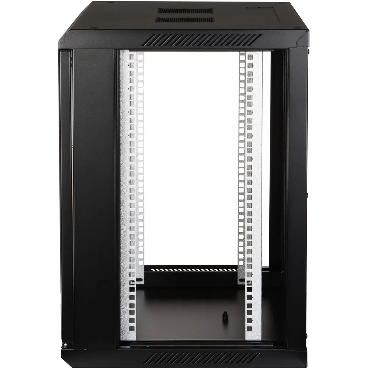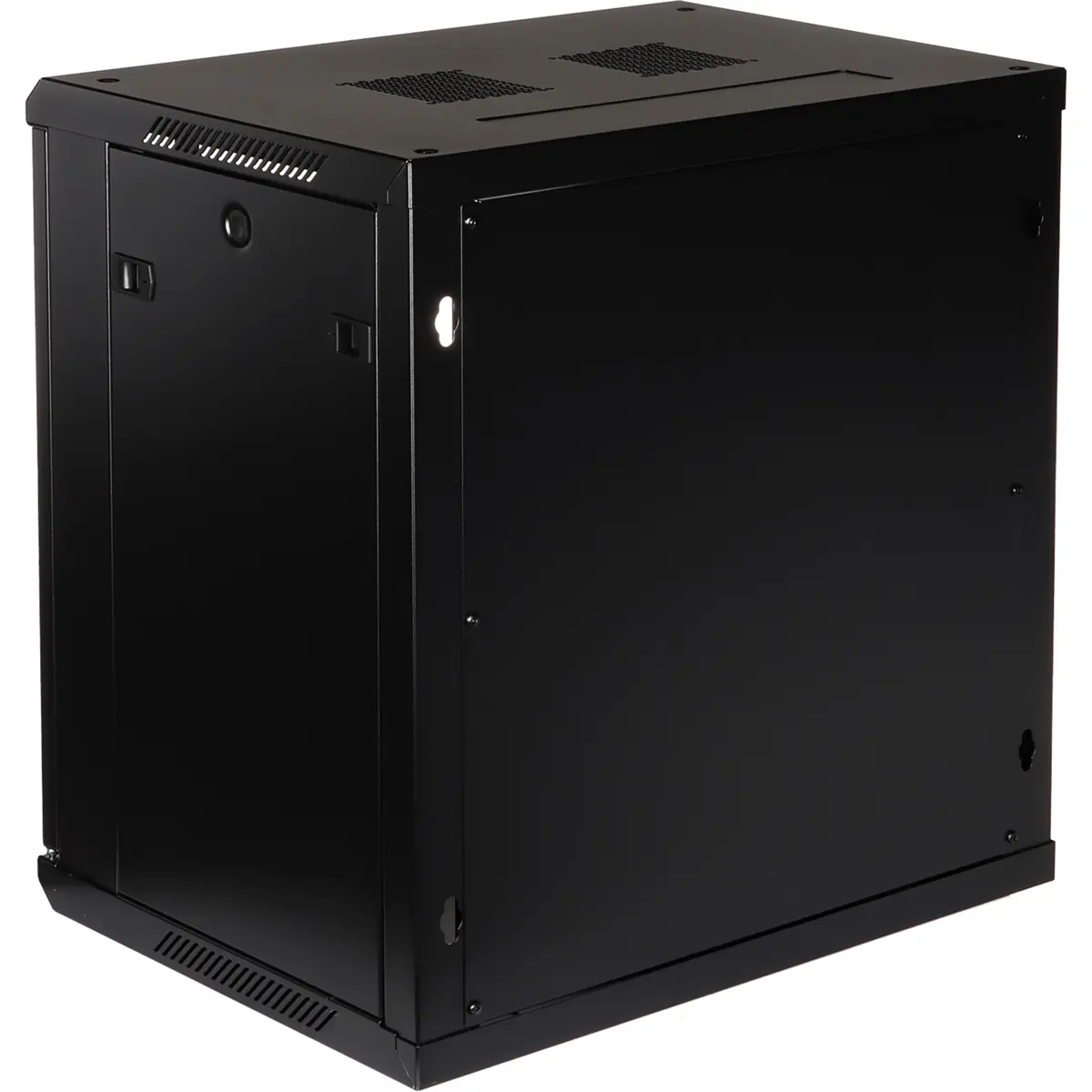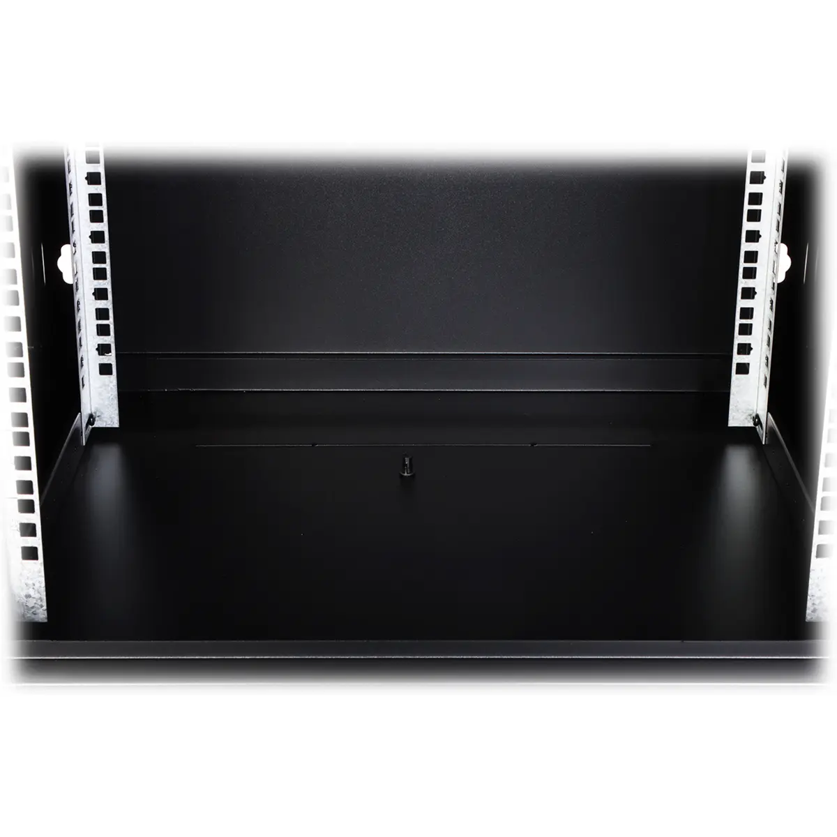 A porta frontal em vidro temperado permite visualização do interior, mantendo segurança e controlo de acessos. Os painéis laterais removíveis facilitam a instalação e manutenção, para acesso rápido aos equipamentos e cablagem. O armário inclui ventilação passiva, com aberturas que ajudam a dissipar o calor, o que contribui para o funcionamento estável dos equipamentos. Fornecido em formato desmontado, permite transporte facilitado e montagem simples no local.