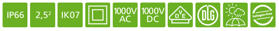 - Certificações: VDE (DIN EN 60670-1/-22), DLG