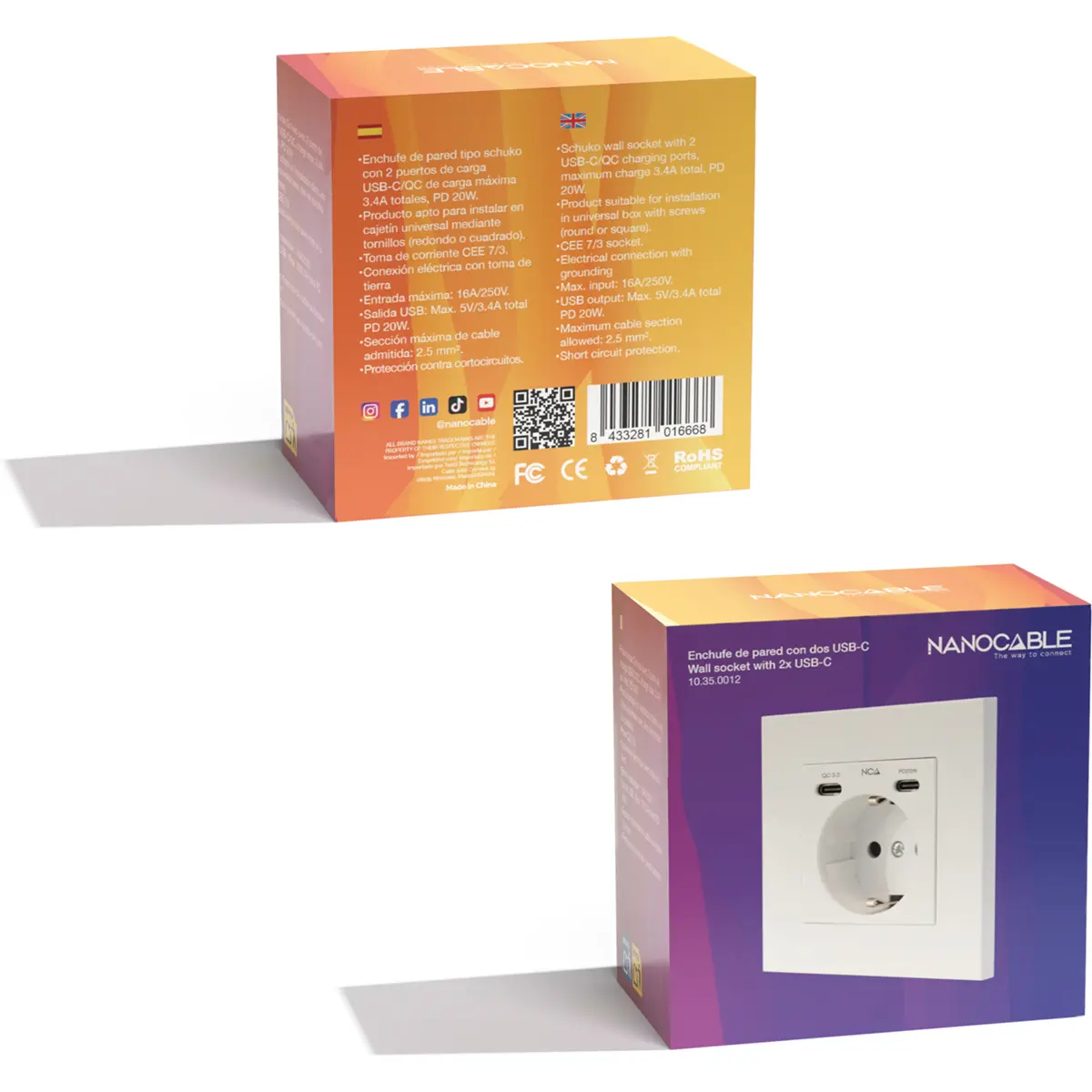 Nanocable 10.35.0012 - Tomada de embutir universal Schuko fêmea c/ 2x USB-C 3.4A PD 20W - Branco