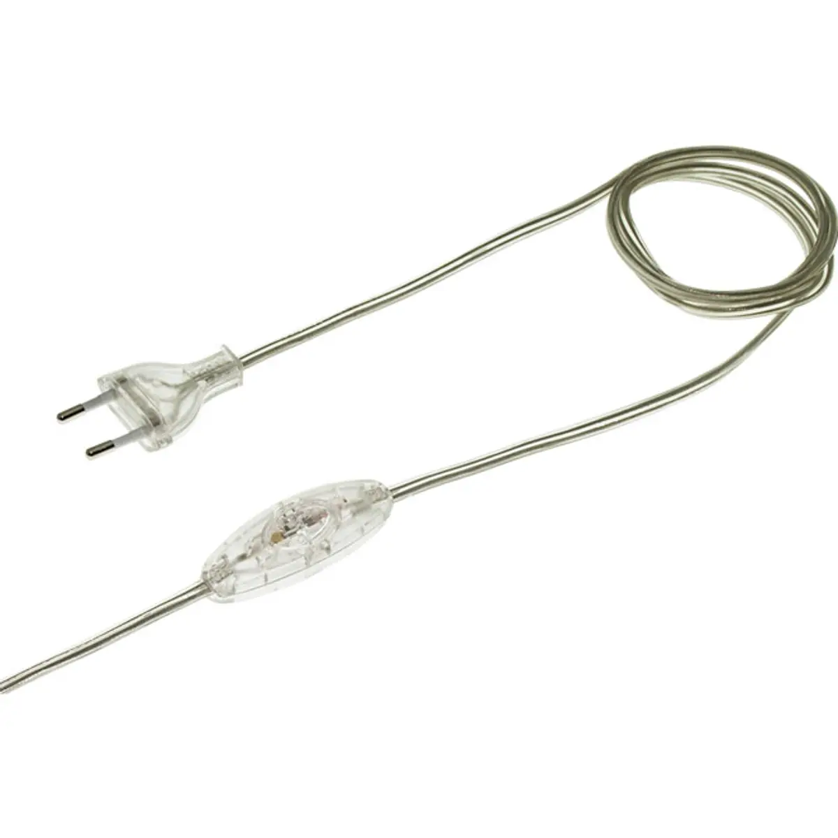 Cabo transparente com ficha europeia 2P tipo C e interruptor integrado (de passagem), para candeeiros ou pequenos equipamentos elétricos.
