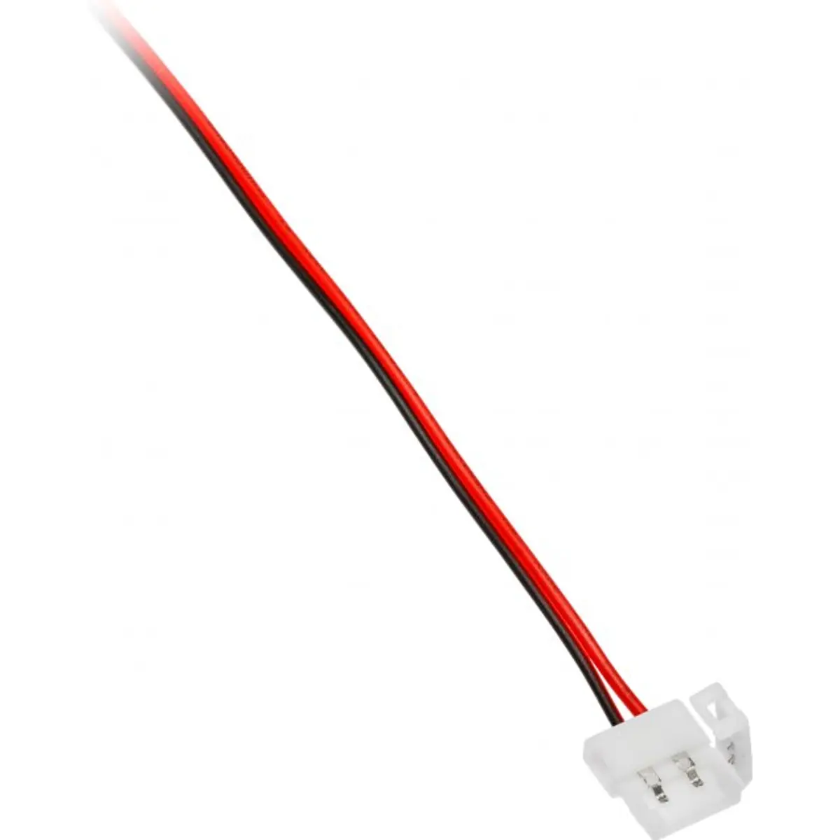 Conector de ligação rápida com dois fios para fita de LED 5050 de 10 mm de largura. Inclui 10 cm de fio, facilitando a instalação e a ligação entre a fita e o conector em projetos de iluminação com tiras LED 5050. Adequado para uso em interiores, com montagem simples e prática, oferecendo uma solução estável para ligações entre segmentos de fita LED 5050.