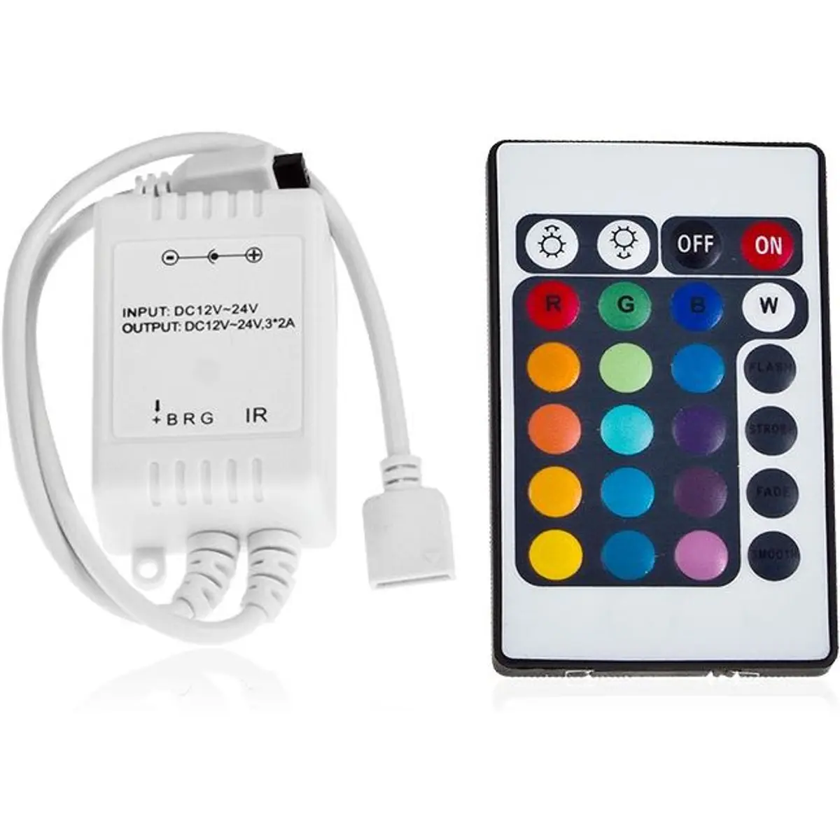 Controlador RGB 12V comutável entre cores de forma abrupta ou suave, oferecendo 16 cores estáticas e 4 programas dinâmicos (Flash, Strobe, Fade, Smooth). Compatível com alimentação de 12V, suporta até 72W e 6A no total (2A por canal) e utiliza ficha DC 5.5x2.1mm. Ideal para iluminação LED interna, com controlo de intensidade e efeitos visuais variados.