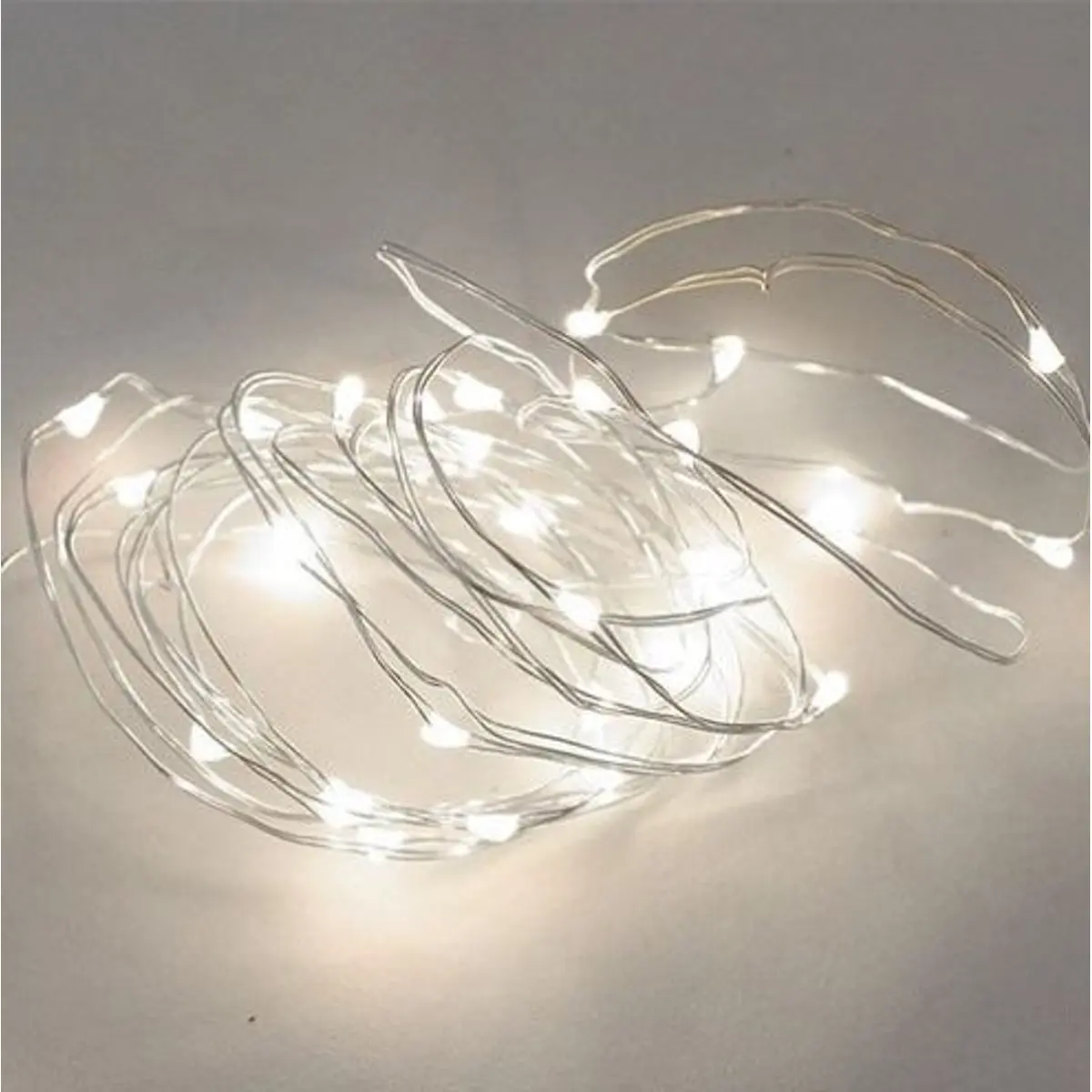 Luzes de Natal com fio de micro-LED branco frio, 2 metros de comprimento e 20 LEDs. Compatíveis com alimentação de 2x LR6/AA, oferecem iluminação discreta e uniforme para decoração interior. Possuem índice de proteção IP20, ideal para uso em ambientes fechados. Não requerem rede elétrica permanente e permitem montagem simples em molduras, árvores e objetos decorativos, sendo uma opção prática para adição de iluminação festiva.