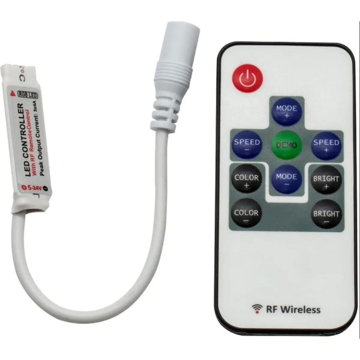 Controlador RGB (RF) para fitas LED RGB 5-24V com controle remoto de 10 botões.