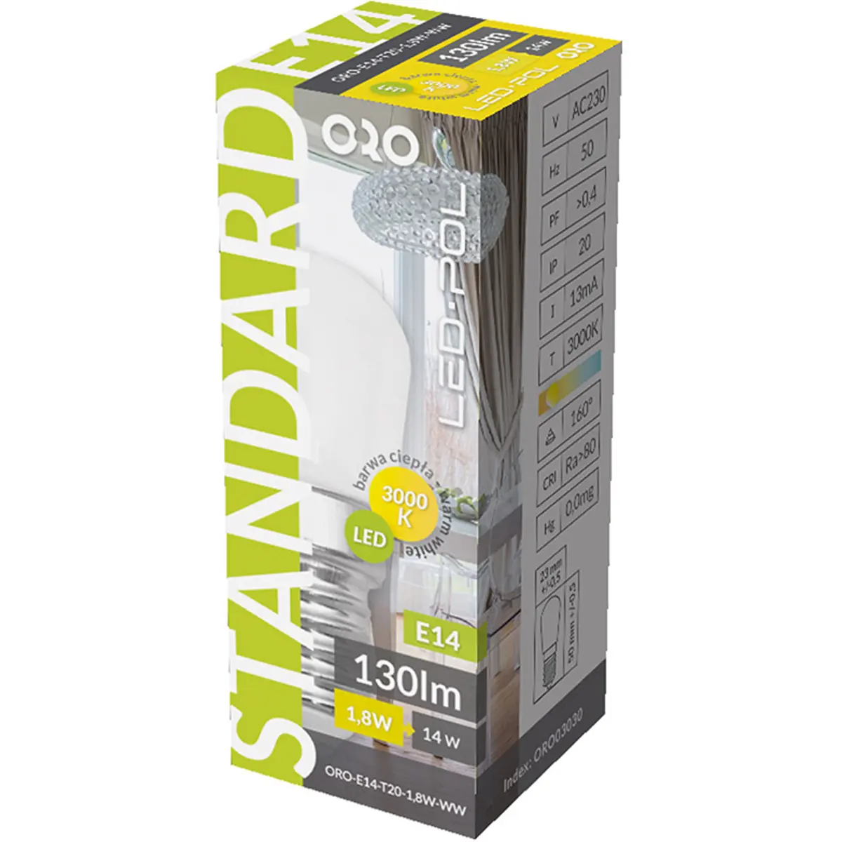 Esta lâmpada LED com base E14 funciona a 230 VAC e consome 1,8 W, emitindo 130 lm numa tonalidade de 3000 K (branco quente). Possui ângulo de abertura de 160°, CRI >=80Ra e fator de potência >0,4, adequada para iluminação interior. Possui proteção IP20 e funciona entre -15ºC e 50ºC. Dimensões Ø23 x 50 mm.