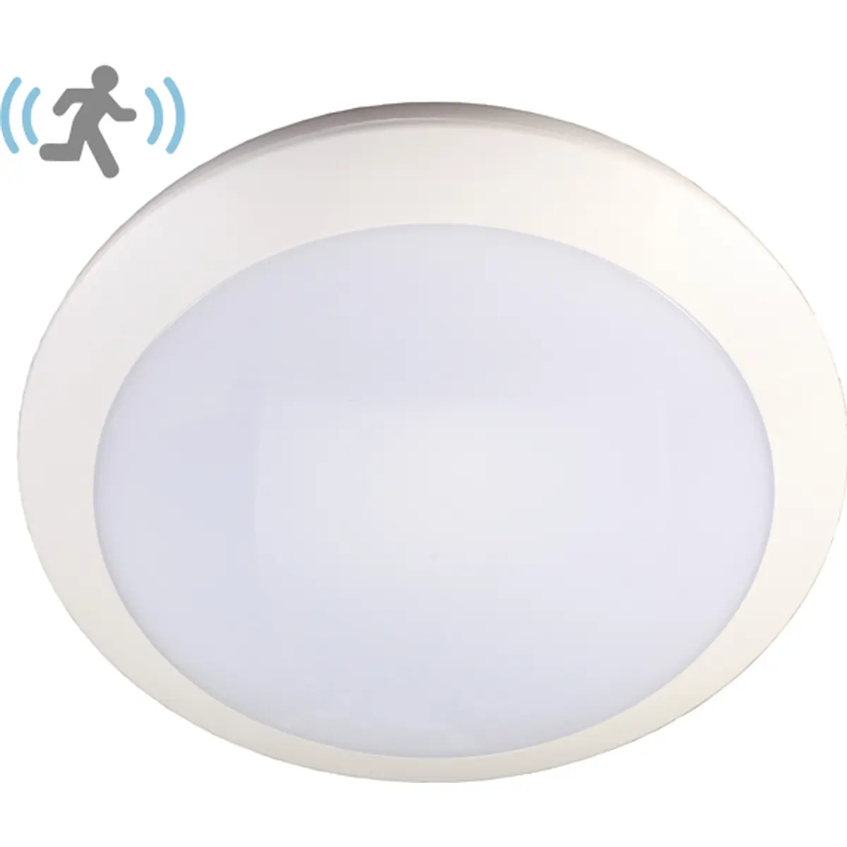 Plafon LED com sensor de movimento para parede ou teto com proteção IP66, adequado a espaços pequenos como lavabos, armários e arrecadações, e também a corredores. Opera a 220-240V AC/50-60Hz, tolera -10 °C a +40 °C, com temporizador de 10s, 90s, 3min ou 10min; sensor crepuscular 5, 15, 50 ou 2000 lux; período de standby 0s, 30s ou 10min; detecção de movimento de 180° (5–15 m) ou 360° (2–8 m); alcance de detecção 10% a 100%; lâmpada 16W LED a 5000K; dimensões Ø30x7 cm.