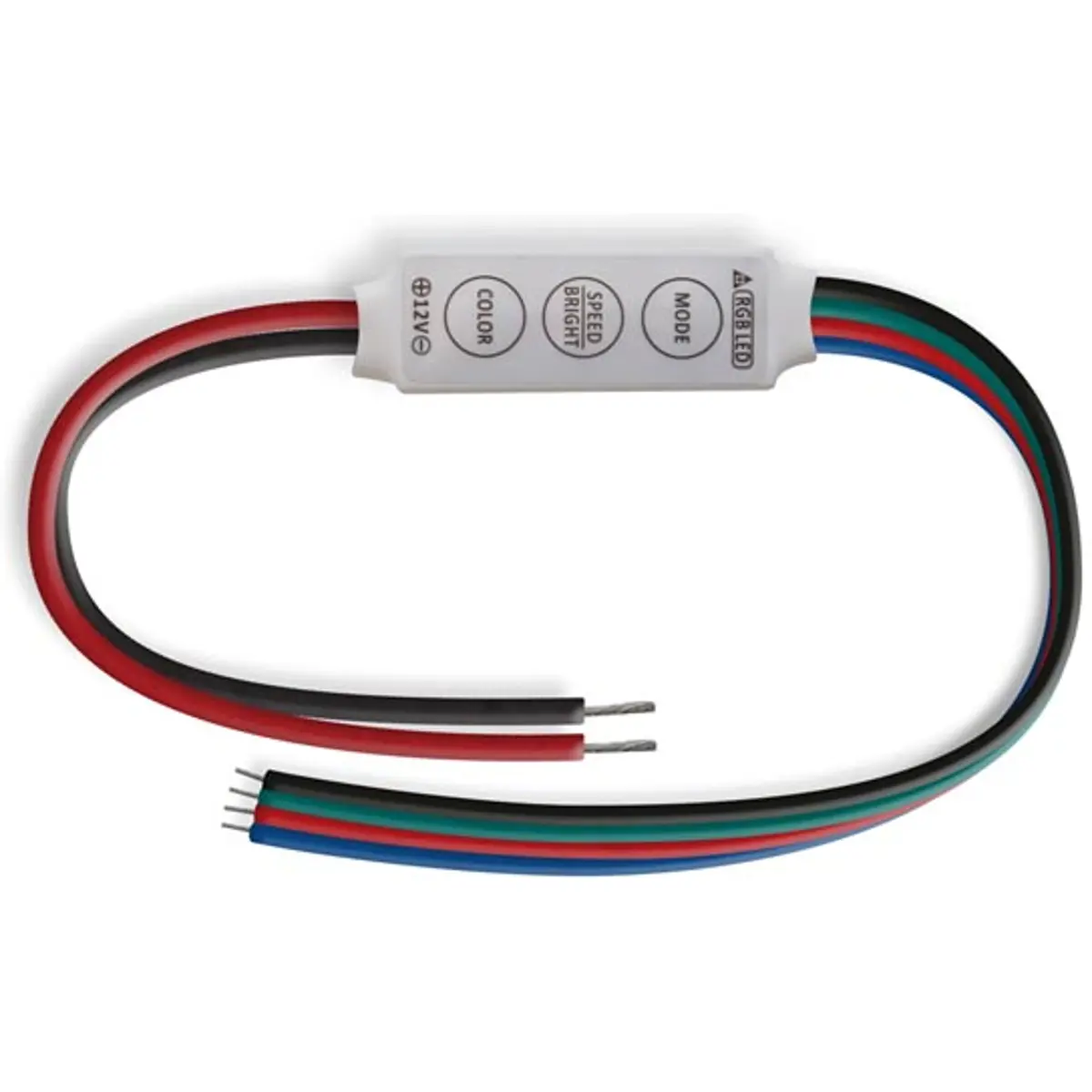 Este pequeno controlador RGB opera com alimentação entre 5 e 24 VDC e oferece quatro funções: comutação on-off, escurecimento 5 níveis, programas autônomos de fade e flash, e seleção de cores com 20 opções. Possui memória que retém a última função após falha de energia. Suporta carga de até 3x2 A com PWM de até 125 Hz. Tamanho compacto 40x13x8 mm, cabo 2x50 cm e peso de 10 g. Requer fontes 60 W/12 V ou 120 W/24 V e não exceder 5 A de saída.