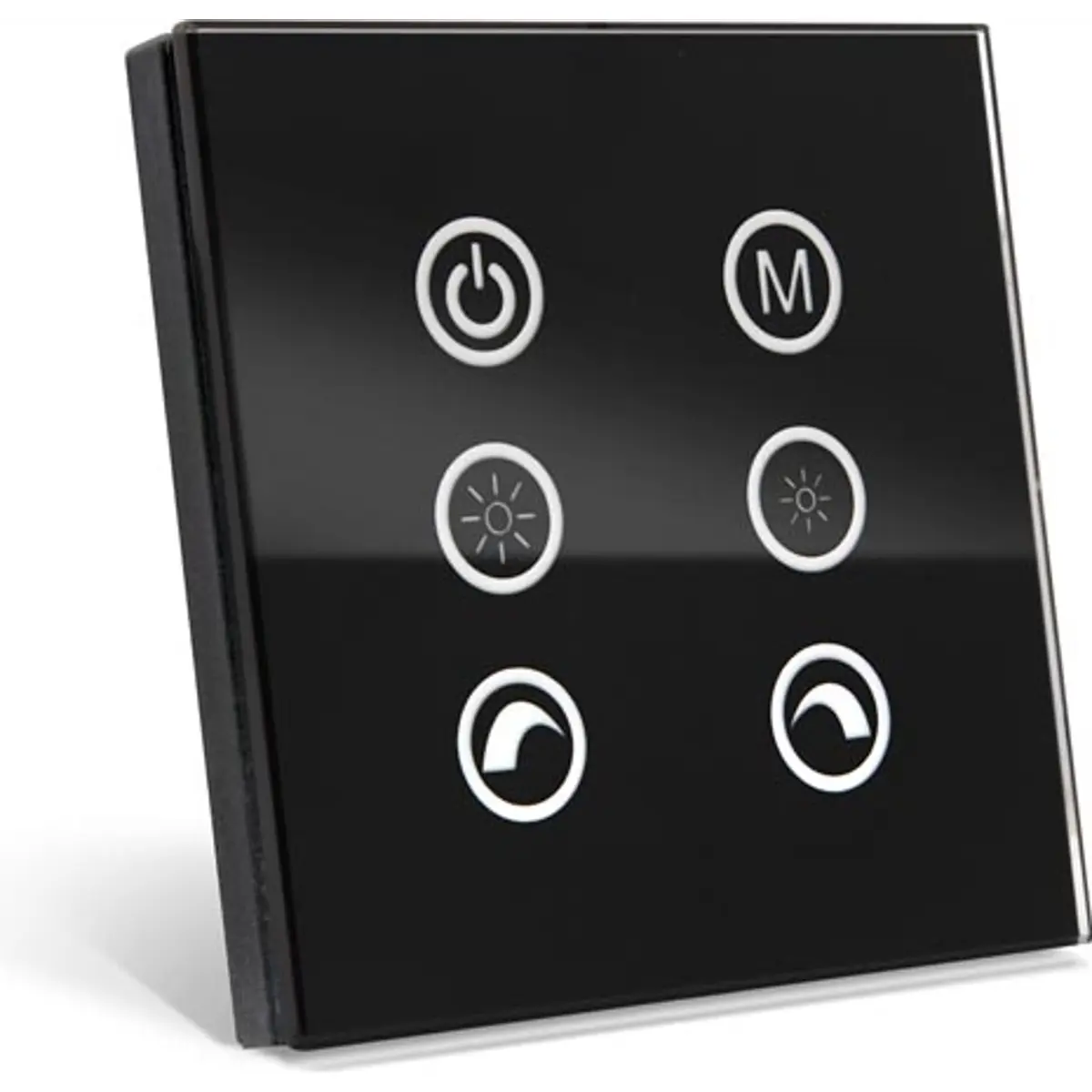 Controlador RGB de parede para faixas LED, alimentado em 12 V DC com carga máxima de 3x4 A. Oferece PWM de alta frequência aprox. 900 Hz, quatro funções (ligar/desligar, regulação da intensidade, animações RGB e seleção de cores) e memória que restaura as últimas funções após falha de corrente. Permite programas automáticos, oferece sete cores RGB e é adequado para montagem em superfície. Dimensões externas 86x86x13 mm, peso 150 g; suporta fontes 12 V (144 W) ou 24 V (288 W), sem exceder 3x4 A.