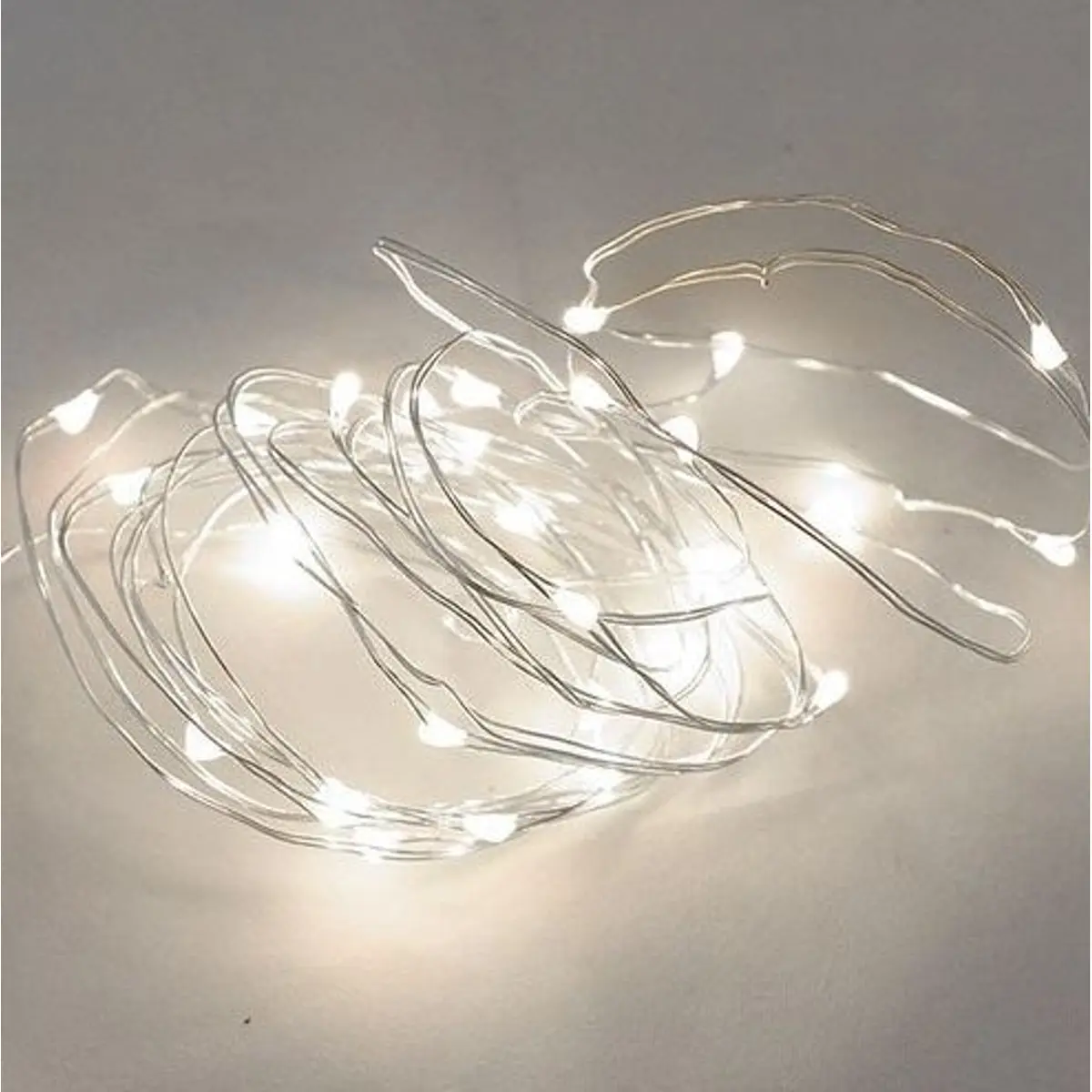 Luzes de Natal micro-LED branco frio com 50 LEDs ao longo de 5 metros, alimentadas a 230V AC. Possui 8 funções de iluminação e índice de proteção IP44, adequadas para decoração em ambientes internos e externos, com possibilidade de instalação simples.