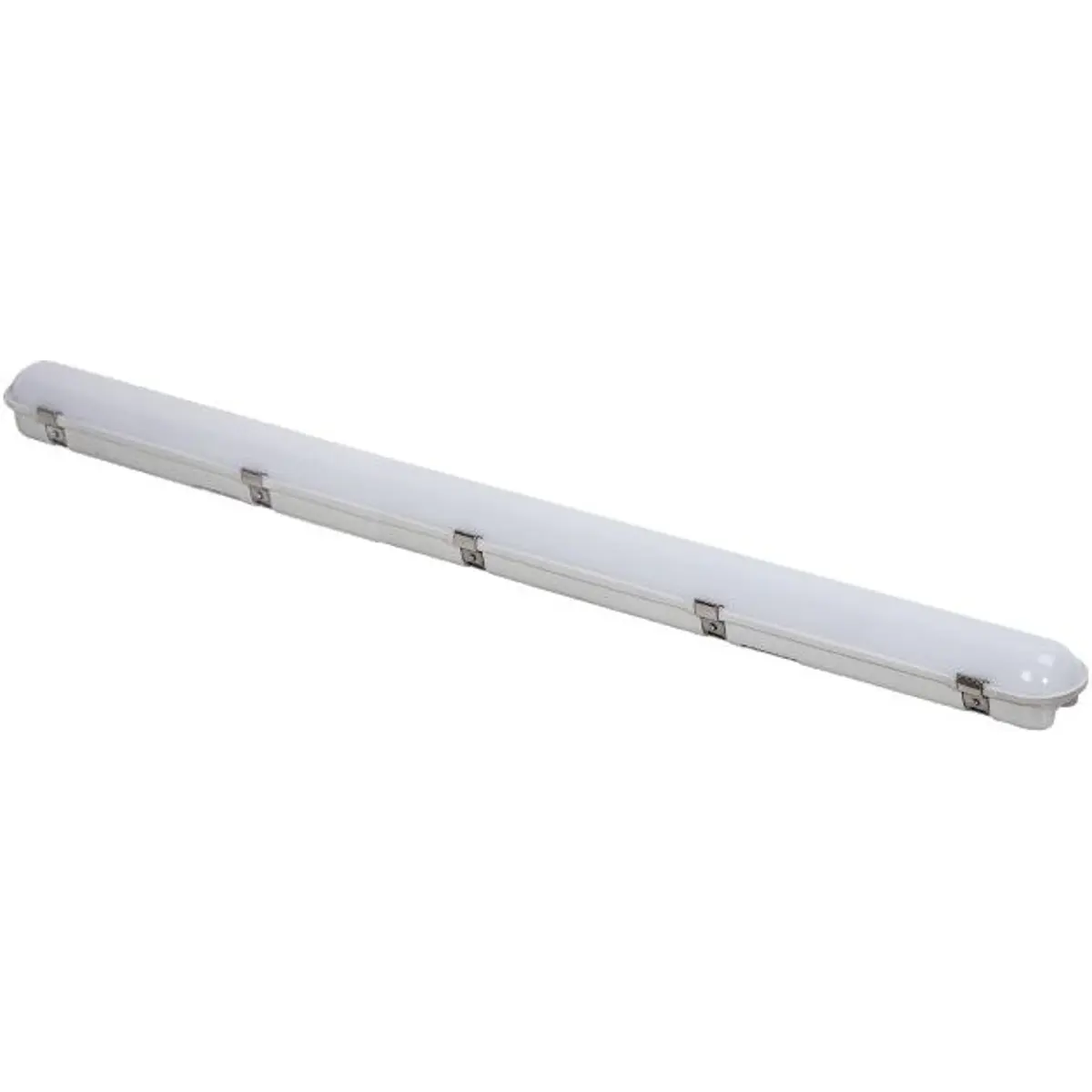 Iluminária estanque de superfície com LED de alto rendimento, 38W e 5320lm, adequada para interiores e exteriores. Opera a 230-240V AC com 4000K (branco neutro) e ângulo de feixe de 120°, oferecendo iluminação ampla e uniforme. Possui IP66 para proteção total contra pó e água, clipes de montagem em aço inoxidável e tampa/caixa resistentes aos UV. Pode ser montada na superfície, substitui diretamente lâmpadas 2x36W T8, com módulo de luz e fonte de alimentação substituíveis e ligação em série de até 32 luminárias.