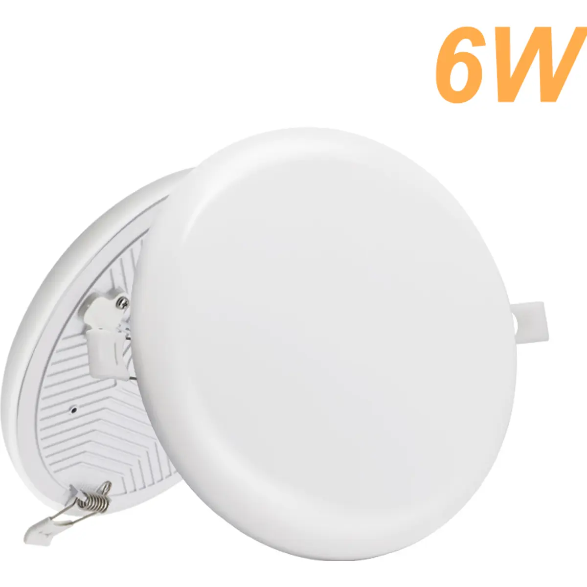 Painel LED sem moldura de tensão entre 85 e 265V AC, operação a 50/60Hz, temperatura de cor entre 4000 e 4200K, fluxo luminoso de 420 lm e potência de 6 W. Ilumina a 180 graus, com CRI de 80 para reprodução fiel de cores e proteção anti-UV. Dimensões Ø90 x 20 mm com furo de montagem Ø75 mm. Ideal para aplicações interiores com montagem simples e design discreto.