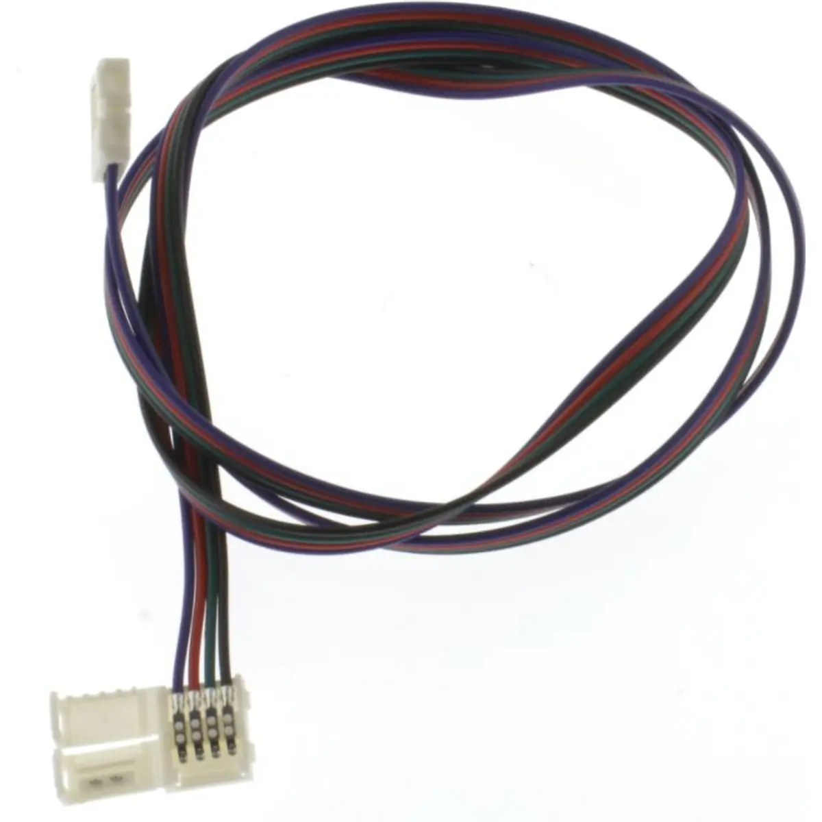 Extensão para fitas de LED RGB com conector e cabo de 100 cm, compatível com tiras de 10 mm (SMD5050). Ideal para prolongar a iluminação em projetos internos, oferecendo ligação rápida e estável sem solda, com encaixe seguro e montagem simples em superfícies planas. Design compacto facilita acabamentos discretos em móveis, escadas e ambientes.