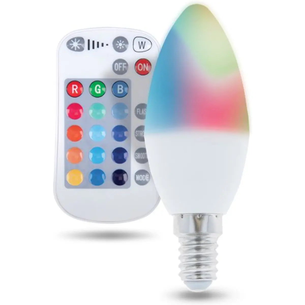 Esta lâmpada LED com base E14 funciona em 230V e consome 5W, oferecendo RGB mais Branco Quente 3000K, 250lm e ângulo de iluminação de 220°. Com diodos 5050 e 2835, CRI superior a 80Ra e comando remoto, permite ajustar cores e intensidade, ideal para iluminação ambiente em casa ou no escritório.