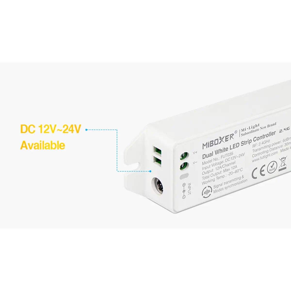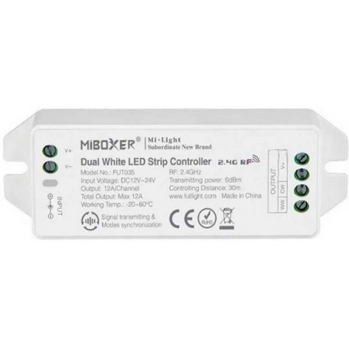Este controlador CCT de 4 zonas para fitas CCT (2 brancos) permite escurecer e ajustar a temperatura de cor do branco por rádio frequência a 2.4 GHz. Pode ligar vários controladores a um controlo remoto para gerir diferentes tiras CCT numa sala. Oferece PWM com duas saídas WW/CW (ânodo comum), alimentação 12-24 V DC, até 12 A, alcance até 30 m em área aberta. Possui memória de configurações, é compatível com Mi-Light e pode integrar-se via Wi-Fi com gateway, cumprindo RoHS e CE.
