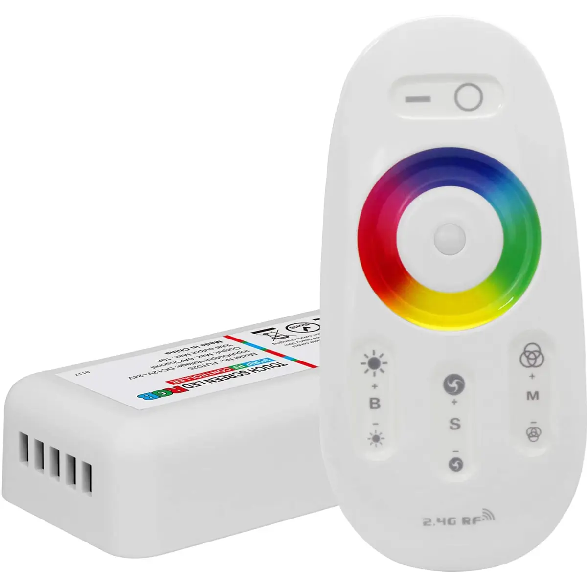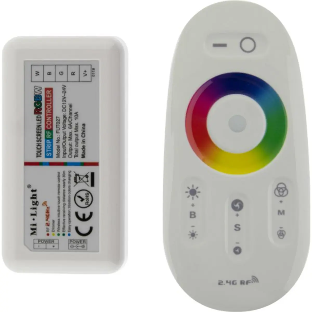 Conjunto completo composto por um controlador RGBW e um controle remoto RGBW touch.