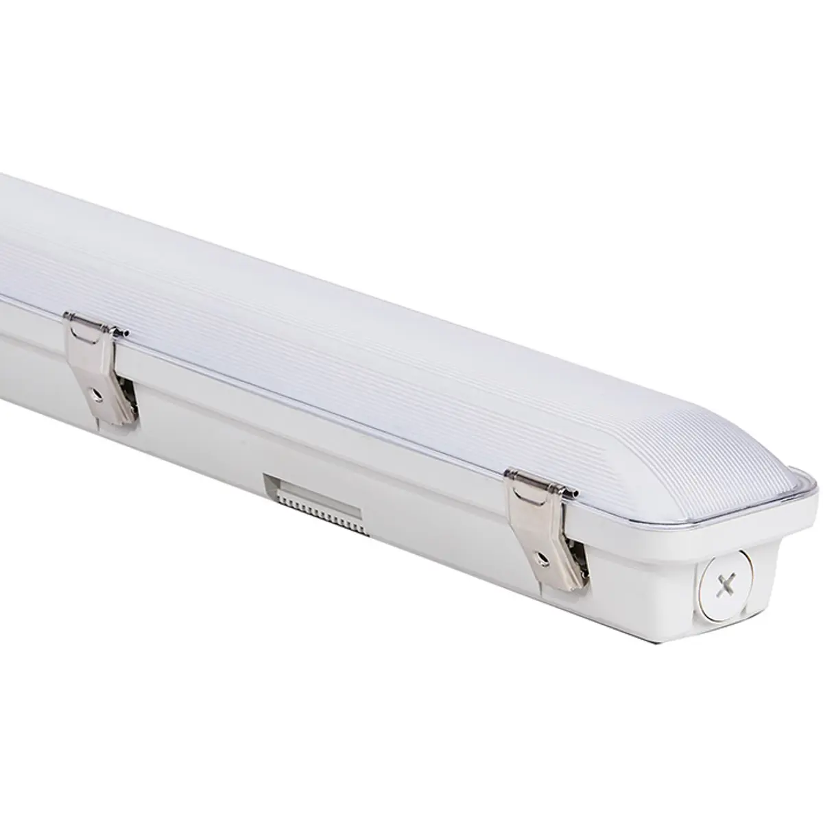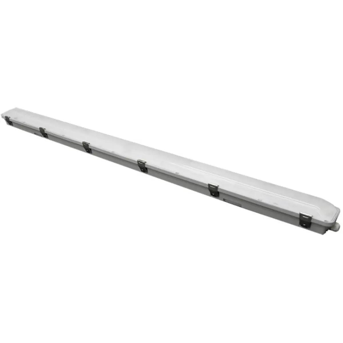 Luminária LED de alto desempenho com potência ajustável entre 32 e 56 W, fluxo luminoso de 4480 a 7840 lm e eficiência de 140 lm/W. Caracteriza-se pelo IP66, temperatura de cor de 4000 K e corpo em policarbonato resistente a UV e impactos. Adequada para montagem linear, com possibilidade de alinhar até 24 unidades, com suporte ajustável e alças em aço inox. Inclui driver, funciona em 220-240 V, 50 Hz, indicada para armazéns, garagens e túneis.