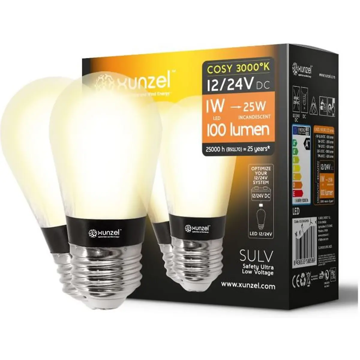 Xunzel LED NATURE 1W-12/24V COSY - Pack de 2 lâmpadas LED E27 12/24V 1W 100lm 3000K (branco quente)