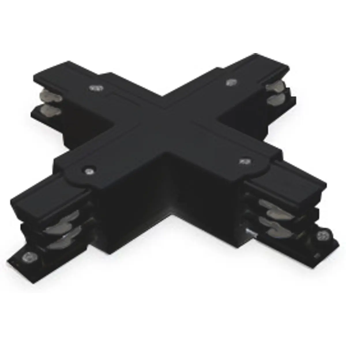 Conector em formato '+' de três vias, concebido para unir quatro calhas brancas num sistema de iluminação. Fabricado em plástico e cobre, apresenta acabamento na cor preta para maior durabilidade. Ideal para instalações com configuração de três vias, assegurando ligações estáveis, continuidade do circuito e montagem simples de estruturas de iluminação com trilho.