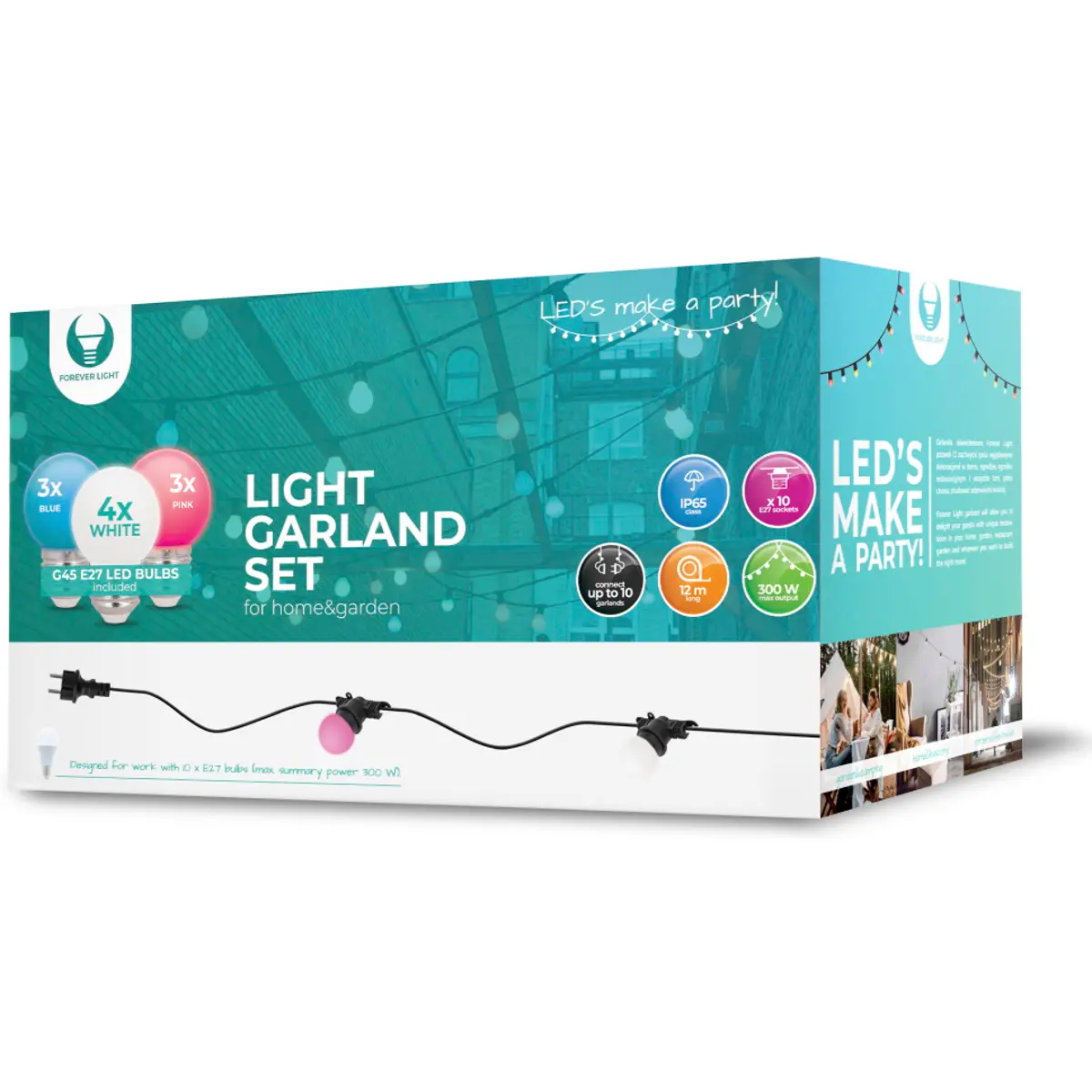 - Inclui 10x lâmpadas E27 G45 2W (3x azuis + 4x brancas + 3x Rosa)