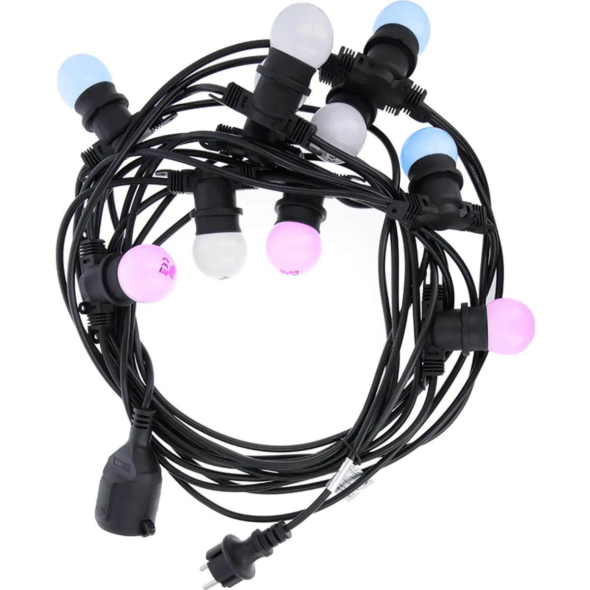 A distância entre as lâmpadas é de 1 metro e o comprimento de toda a guirlanda é de 12 metros. Os primeiros 2 metros da ficha à primeira lâmpada permitem-lhe instalar livremente a guirlanda sem se preocupar se a primeira lâmpada está muito baixa! O último metro do cabo permite estendê-lo convenientemente com outra guirlanda. A seção transversal do fio de 2x0,75mm2 permite conectar até 10 grinaldas e iluminar uma área maior, como pistas de dança, restaurantes ou grandes jardins.