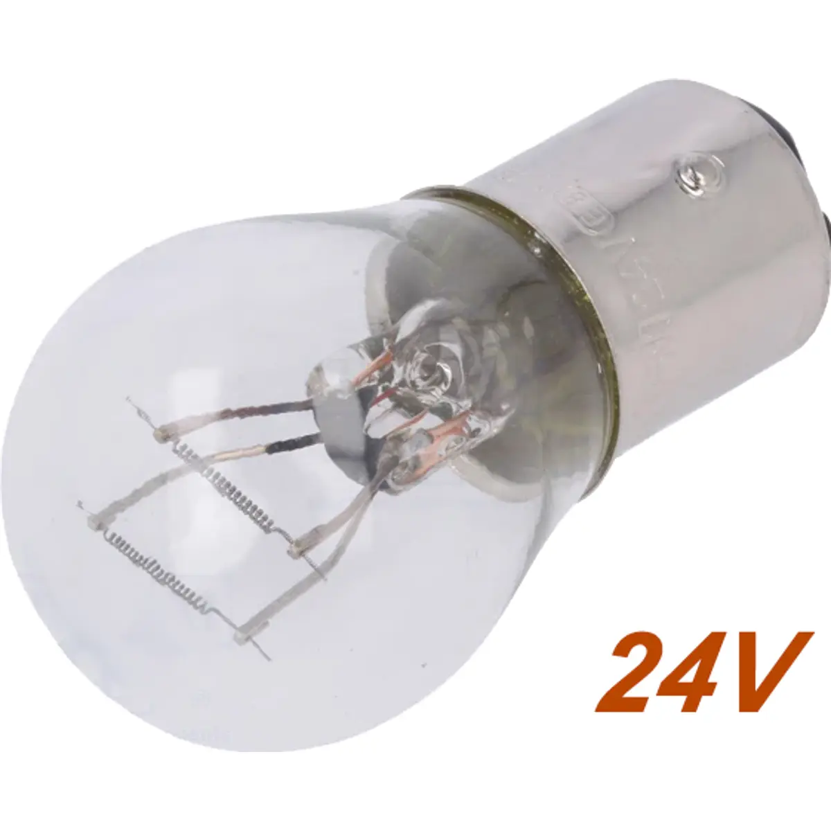 Lâmpada automóvel de 24V com base BAY15D SBC, tipo P21/5W, para camiões. Possui dois filamentos de 21W e 5W para iluminação de posição e travão, com vidro transparente e montagem simples. Fabricante LUCAS, modelo LLB294T, inclui uma unidade. Ideal para substituição direta, garantindo desempenho estável, durabilidade e iluminação confiável em veículos pesados.