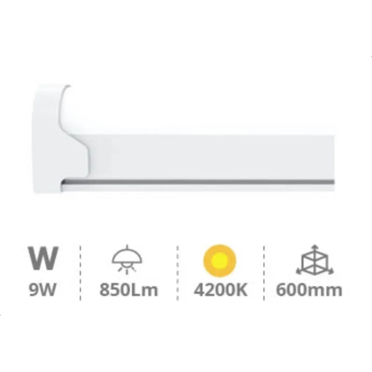 A luminária LED tipo T8, 230V, 9W, com fluxo luminoso de 850lm e temperatura de cor de 4200K, tem dimensões de 600 x 27.7 x 39.2 mm. Indicada para instalação em armários, garagens e cozinhas, com ligador na parte traseira para montagem simples e iluminação eficiente em espaços confinados.