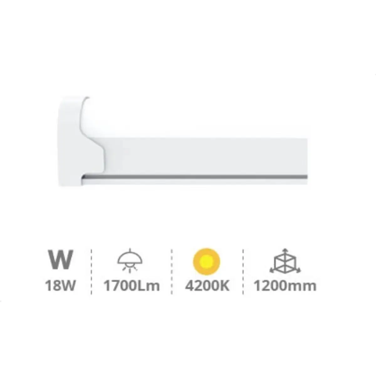 Esta luminária LED do tipo T8 funciona a 230V e é indicada para montagem em armários, garagens e cozinhas. Com 18W de potência, fluxo luminoso de 1700 lúmens e temperatura de cor de 4200K, oferece iluminação branca neutra para áreas de trabalho. Mede 1200 x 27,7 x 39,2 mm e utiliza um ligador na traseira para uma instalação simples. Ideal para uso permanente, combina eficiência energética com fácil montagem.