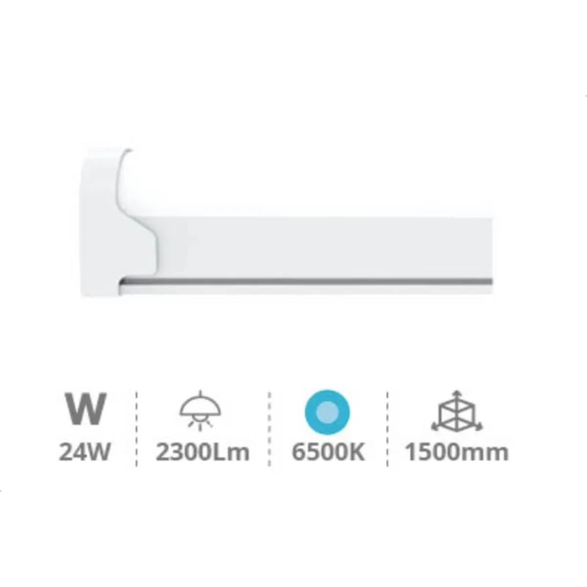 Luminária LED do tipo T8 para instalação em armários, garagens e cozinhas, alimentada a 230V, com 24W de potência. Possui temperatura de cor de 6500K e fluxo luminoso de 2300lm, oferecendo iluminação clara e eficiente. Mede 1500 x 27.7 x 39.2 mm e traz ligador na traseira para montagem simples. Ideal para iluminação de espaços reduzidos com tecnologia LED, proporcionando durabilidade, baixo consumo energético e iluminação estável sem cintilações.
