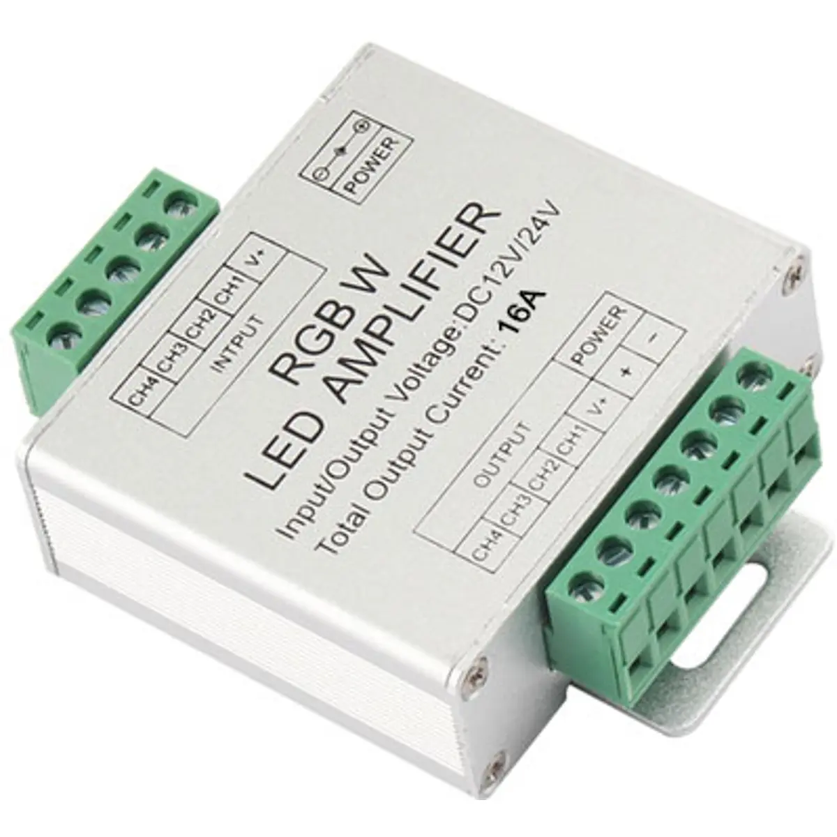 Repetidor RGBW de 12–24 V DC que amplifica o sinal de um controlador RGBW, permitindo gerir mais fitas LED RGBW com um único controlador. Prevê evitar quedas de tensão em extensões longas, assegurando uma iluminação estável. Possui quatro saídas por cor com corrente máxima de 4 A, ligação de ânodo comum (+), funcionamento entre -20 °C e 60 °C; dimensões de 81x64x24 mm e peso de 84 g. Ideal para instalações residenciais e comerciais que exijam fiabilidade e controlo centralizado.