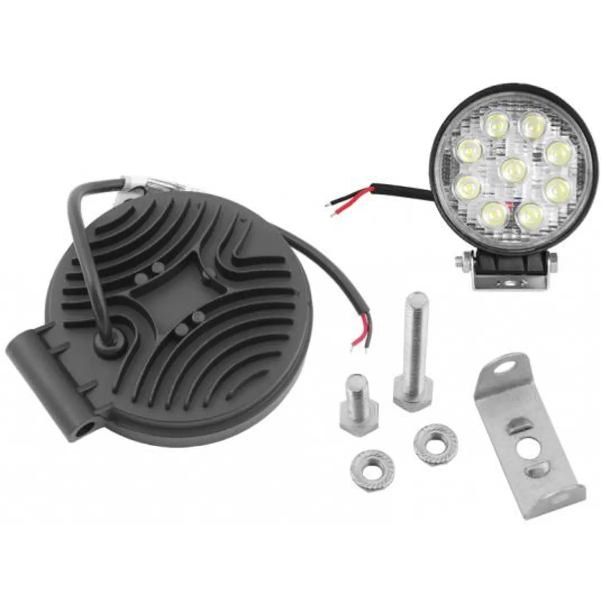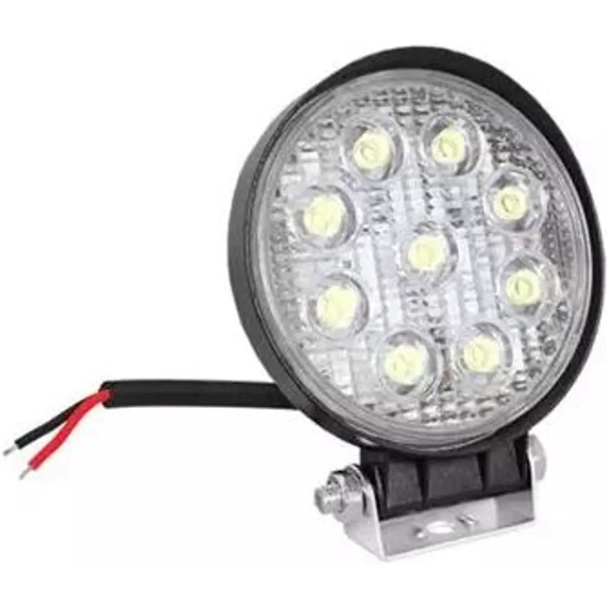 Iluminador LED para automóveis com alimentação 9-60V e consumo de 27W, tecnologia LED e corpo preto. Lâmpada de formato redondo de Ø110mm com 9 LEDs, oferecendo iluminação durável e fiável para ambientes exteriores. Proteção IP67 contra água e poeira, adequado para uso em condições adversas, com desempenho estável em várias aplicações off-road.