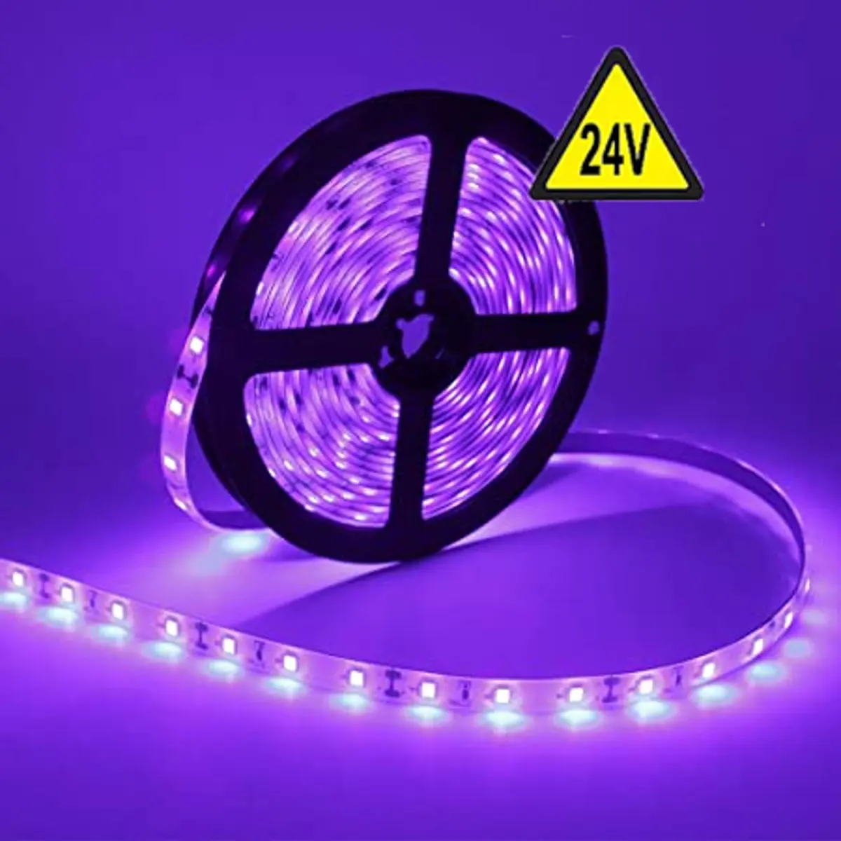 Fita de LEDs ultravioleta alimentada em 24VDC, com 5 metros de comprimento e potência total de 60W (12W por metro). Possui 300 LEDs SMD2835, emitindo luz na cor UV com comprimento de onda entre 395 e 400 nm, e ângulo de abertura de 120°. Com IP20 e dimensões de 10x2 mm, inclui pré-ligação por pontas de fios nas duas extremidades, facilitando a montagem em várias aplicações de iluminação e configuração modular.