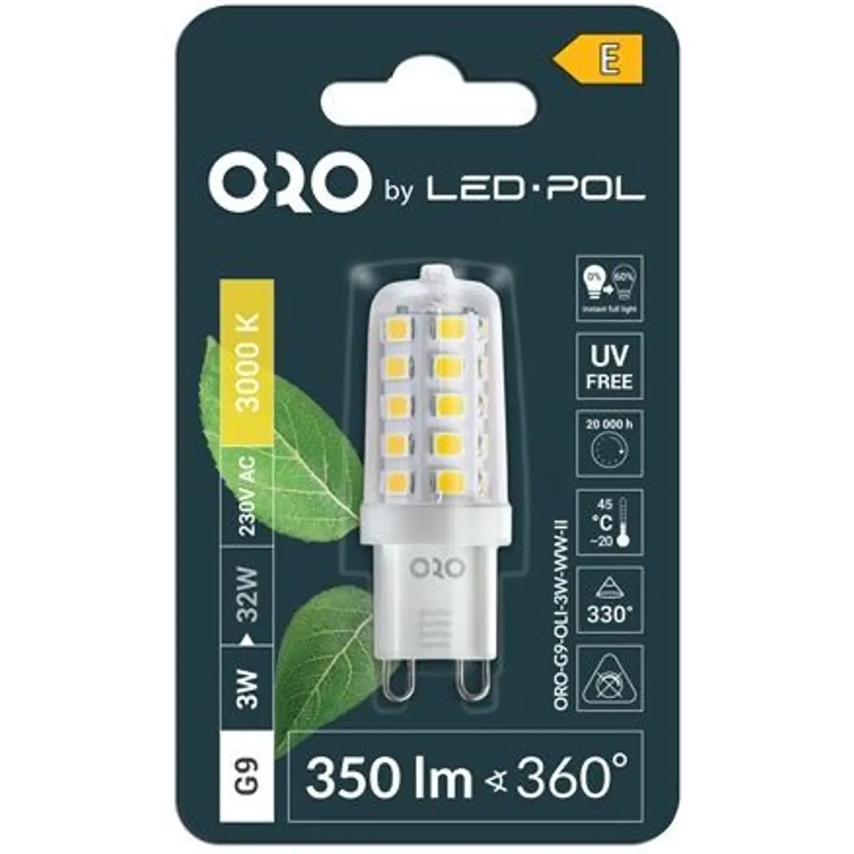 LED com base G9 para alimentação a 230V, potência de 3W, temperatura de cor de 3000K (branco quente) e fluxo luminoso de 350lm. Possui ângulo de abertura de 360°, não dimável, com fator de potência de 0,4 e CRI >= 80Ra, oferecendo iluminação estável para interiores. Classe energética E e dimensões compactas Ø16x50mm, com tempo de atingimento do fluxo luminoso máximo inferior a 0,5s.