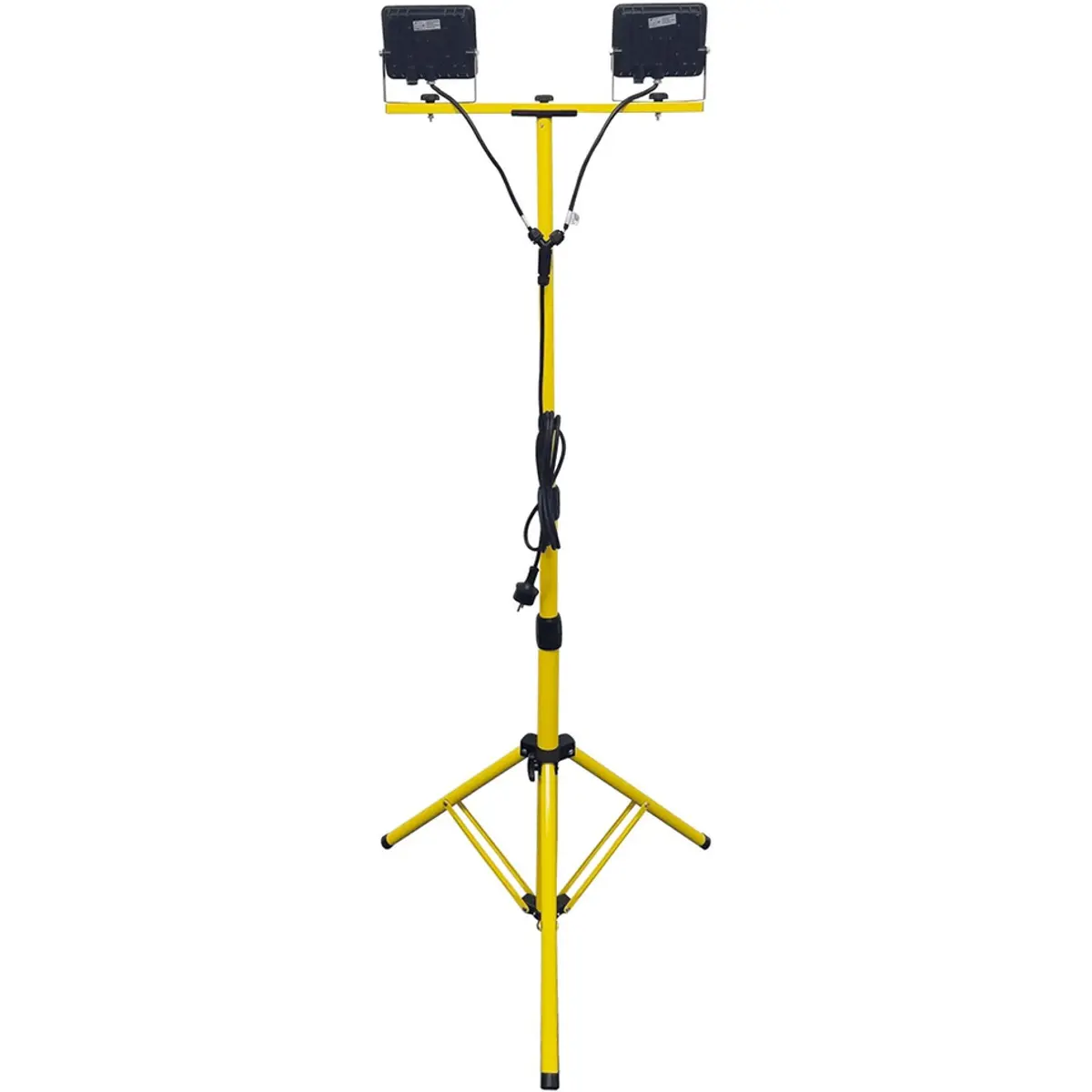 O projetor LED duplo para uso exterior oferece iluminação potente com 2x30W, total de 5200 lm e temperatura de cor de 6500K (luz branca fria). A estrutura em alumínio com vidro temperado facilita a dissipação de calor e oferece proteção IP65 contra intempéries. Inclui tripé telescópico dobrável para montagem rápida, feixe de 120°, tempo de arranque < 0,5 s, tempo de aquecimento (60%) < 0,5 s, índice de renderização de cor (CRI) > 80, vida útil nominal de 30.000 h e até 100.000 ciclos de comutação. O cabo de alimentação tem 3 m de comprimento (H05RN-F 3G1.00 mm²). Ideal para obras e uso externo, resistente a poeira, água e condições adversas.
