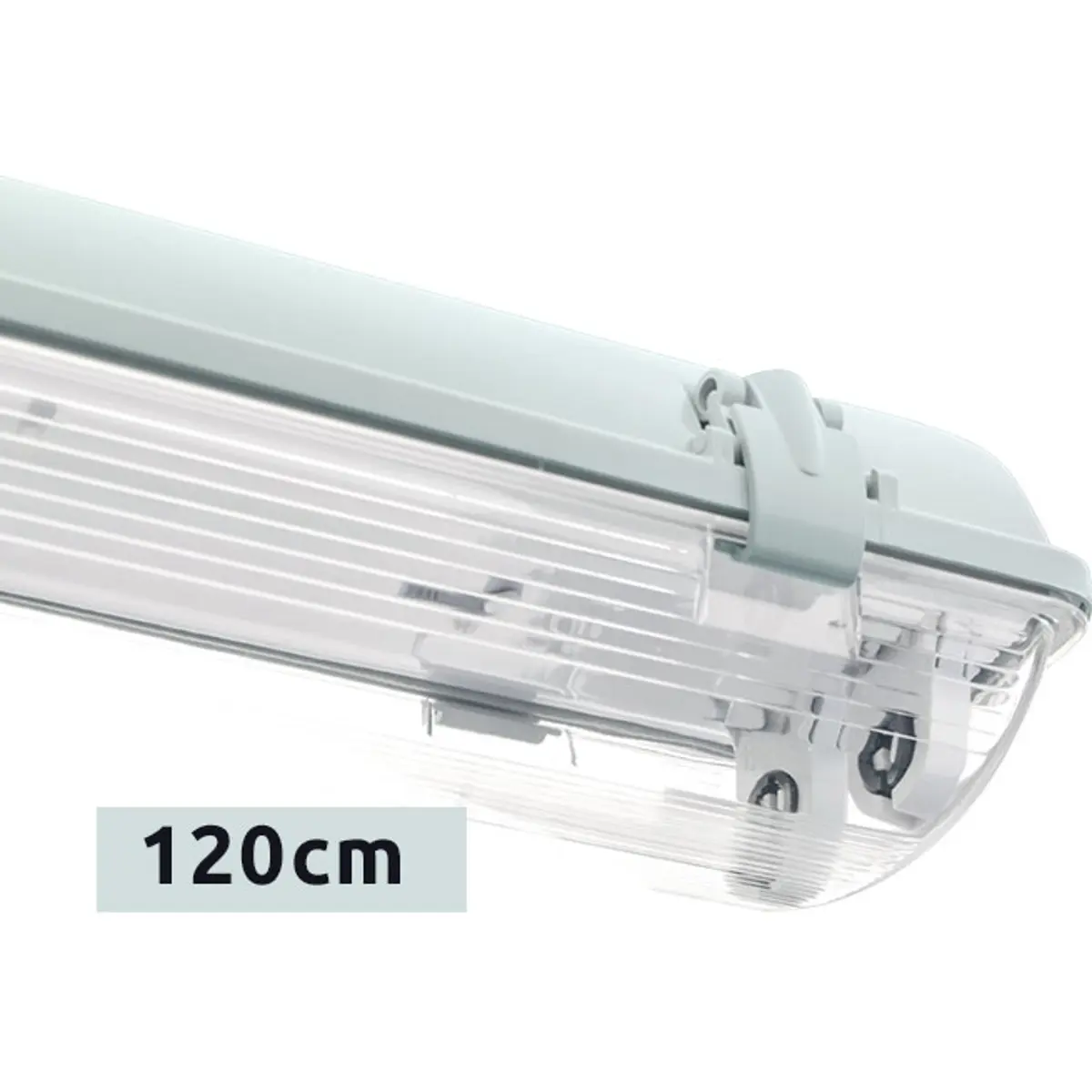 Armadura para tubos LED T8, 2x120 cm, com classificação IP54, adequada para ambientes interiores e industriais leves, oferecendo proteção contra poeira e salpicos de água. Compatível com lâmpadas até 22 W por tubo (T8), alimentada a 230 V 50 Hz. Fabricada em ABS e PS, com acabamento cinzento. Dimensões: 126 cm de comprimento, 11,5 cm de largura e 9 cm de altura. Não inclui lâmpadas.