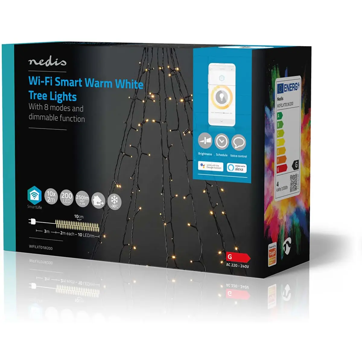 Este conjuntos de luzes que formam um cone luminoso inteligente (com conectividade WiFi), possui 200 LEDs de luz branca quente e fria, tem 10 cordas de 2 metros e é especialmente feito para pendurar em mastros, pérgolas ou pátios, (mas também pode ser colocado numa árvore de Natal).