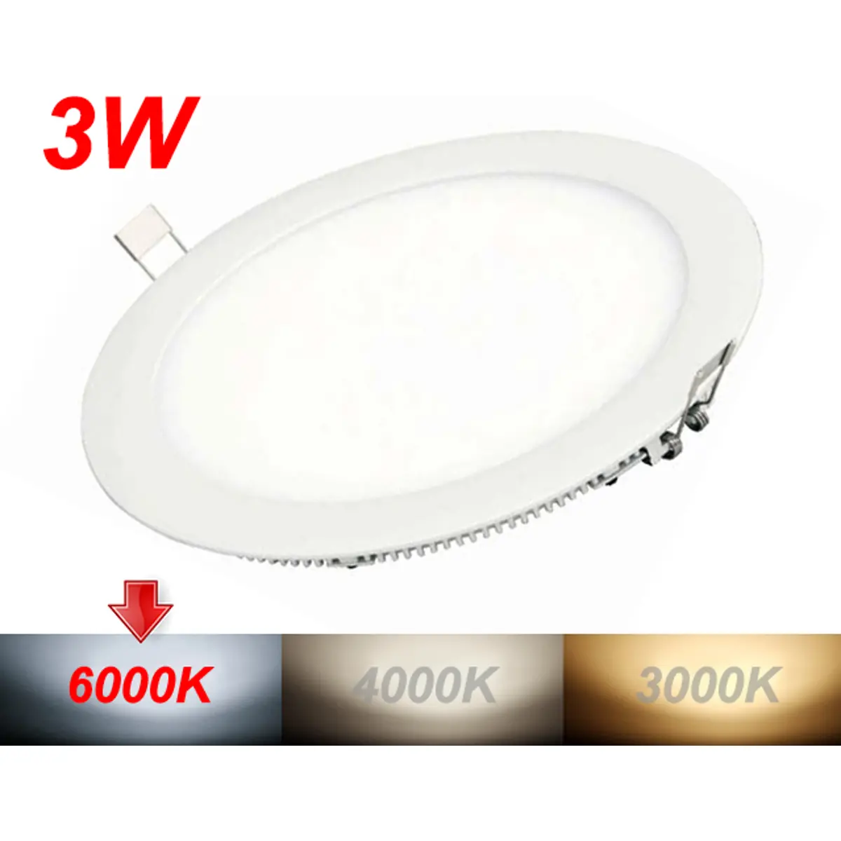 Luminária LED redonda de embutir com driver incluído, alimentada por 230VAC/50Hz, potência de 3W e fluxo luminoso de 136lm. Temperatura de cor de 6000K (luz fria) e CRI <80Ra. Índice de proteção IP20; ângulo de abertura de 120º. Dimensões de instalação Ø70mm e tamanho total Ø82x14mm. Solução eficiente para iluminação interior com montagem discreta em tecto.