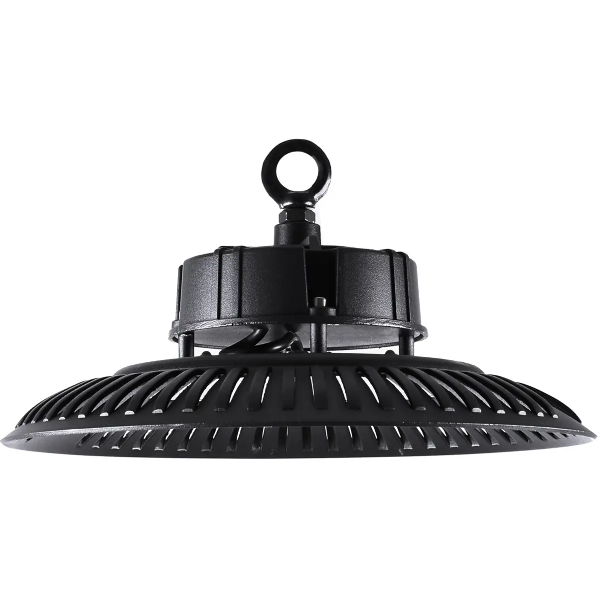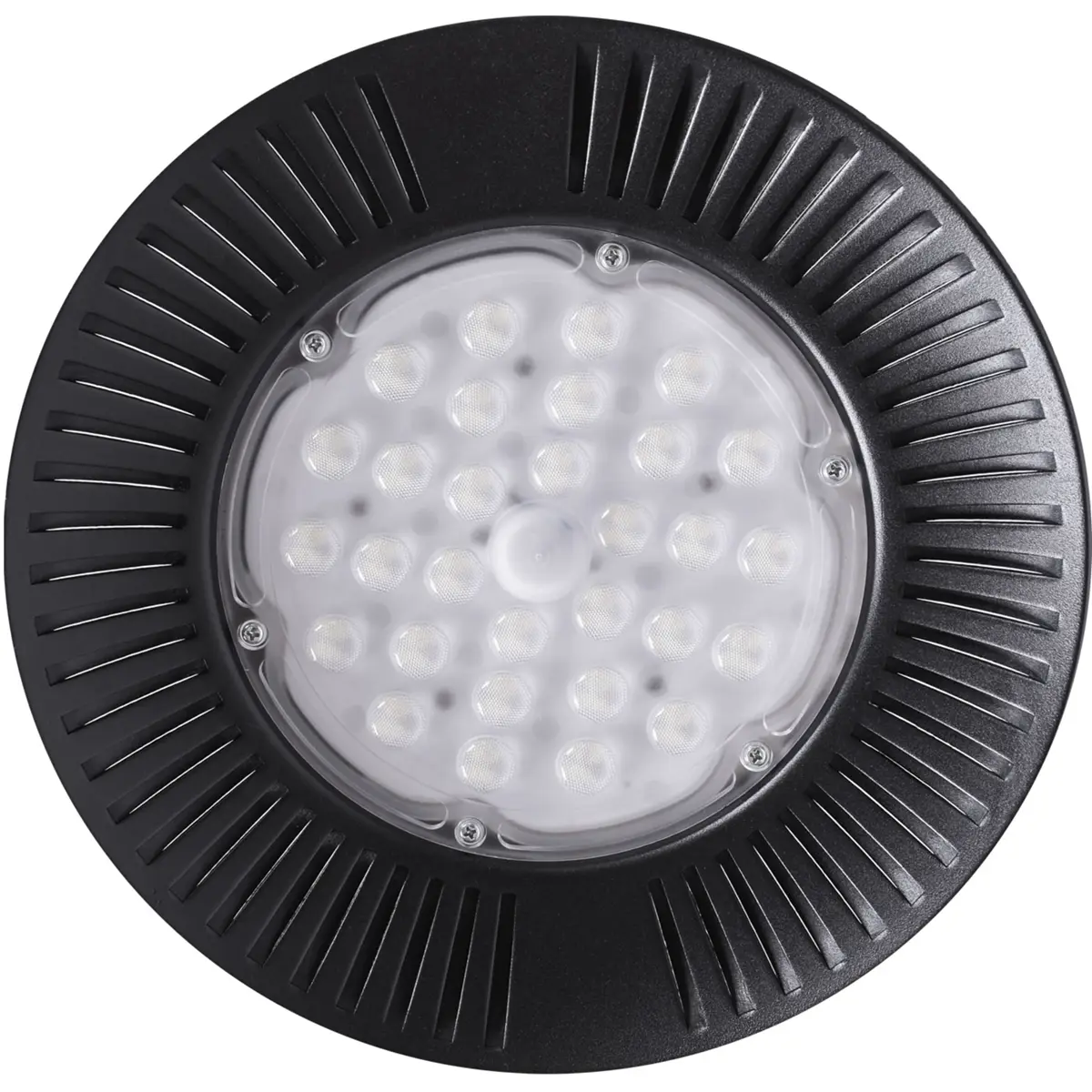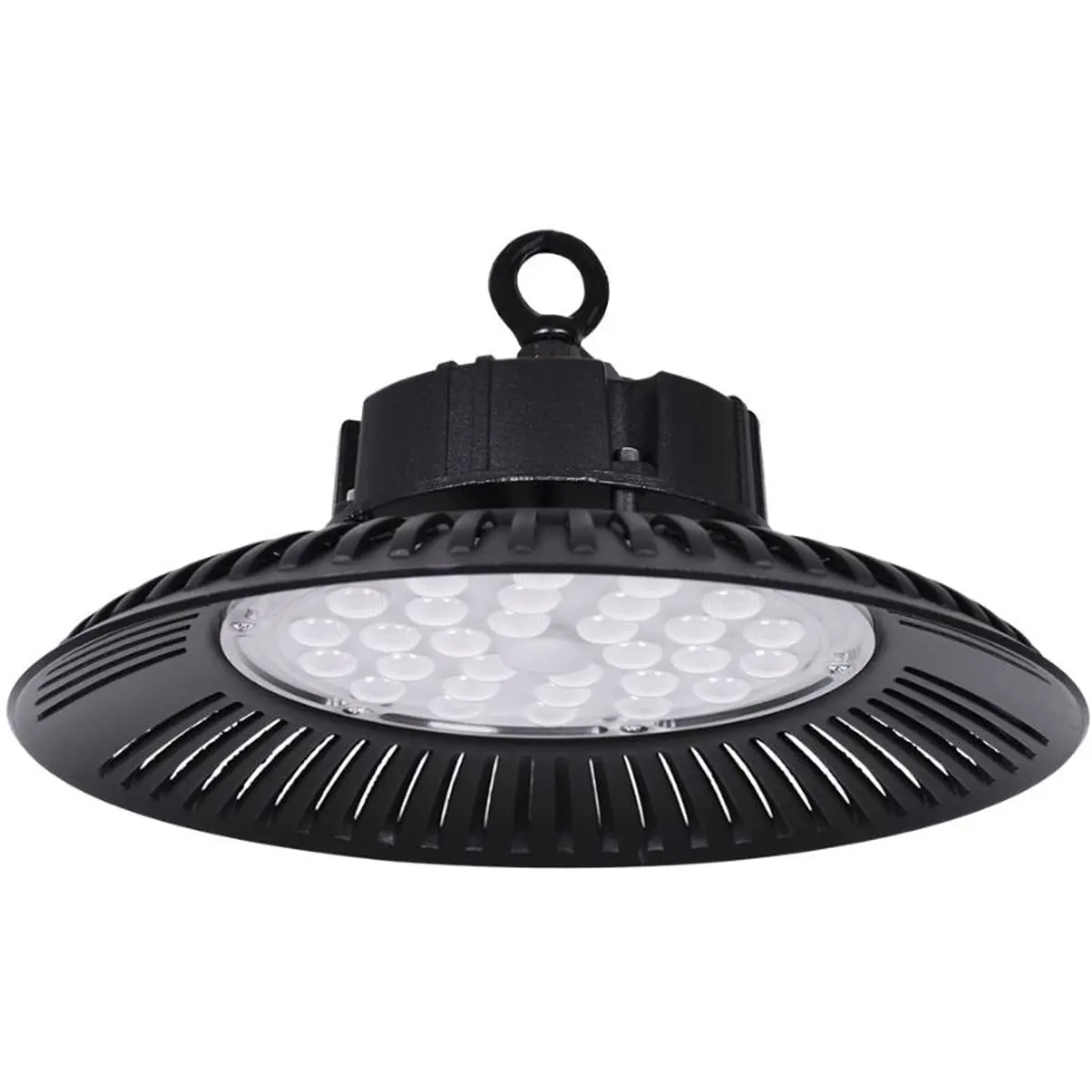 Luminária de campânula com LED integrado, corpo em formato redondo e cor preta. Dimensões Ø30x12cm, proteção IP65, funcionamento a 220-240 V, potência até 100 W e fluxo de 8000 lm a 6400 K (luz branca fria). Ângulo de abertura de 90°, fator de potência 0,9 e índice de reprodução de cor de 80. A lâmpada está incluída e a vida útil é de 25.000 horas.