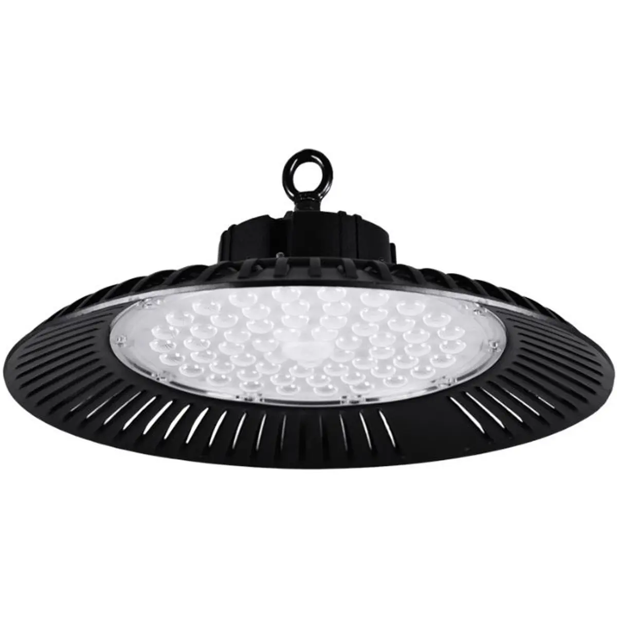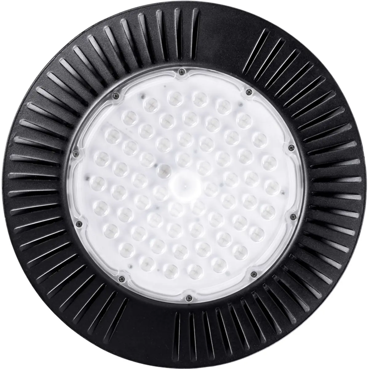 Luminária LED para iluminação industrial de alto vão com LED integrado, corpo redondo e campânulas na cor preta. Opera a 220-240 V, 50/60 Hz, fornecendo 12.000 lm a 6.400 K (luz branca fria). Ângulo de abertura de 90°, IP65, potência de 150 W, fator de potência 0,9 e índice de reprodução de cor Ra 80. Lâmpada incluída, vida útil até 25.000 h. Dimensões Ø34x12cm.